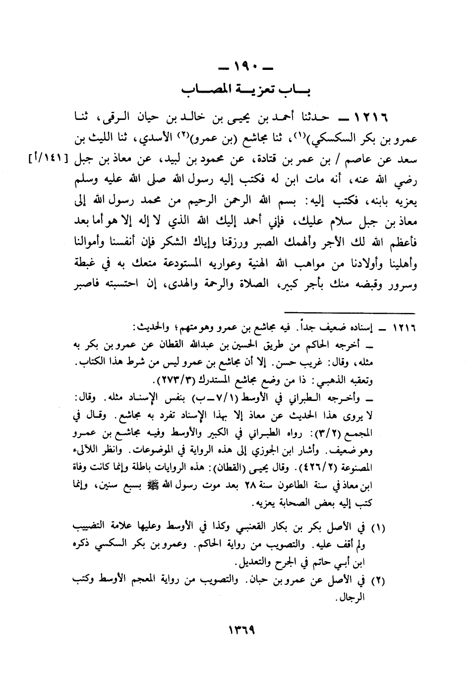 1216- حَدَّثَنَا أَحْمَدُ بْنُ يَحْيَى بْنِ خَالِدِ بْنِ حَيَّانَ الرَّقِّيُّ، حَدَّثَنَا عَمْرُو بْنُ بَكْرٍ السَّكْسَكِيُّ، حَدَّثَنَا مُجَاشِعُ بْنُ عَمْرٍو الأَسَدِيُّ، حَدَّثَنَا اللَّيْثُ بْنُ سَعْدٍ، عَنْ عَاصِمِ بْنِ عُمَرَ بْنِ قَتَادَةَ، عَنْ مَحْمُودِ بْنِ لَبِيدٍ، عَنْ مُعَاذِ بْنِ جَبَلٍ، رَضِيَ اللَّهُ عَنْهُ, أَنَّهُ مَاتَ ابْنٌ لَهُ, فَكَتَبَ إِلَيْهِ رَسُولُ اللهِ صَلى الله عَلَيه وَسَلم يُعَزِّيهِ بِابْنِهِ، فَكَتَبَ إِلَيْهِ: بِسْمِ اللهِ الرَّحْمَنِ الرَّحِيمِ مِنْ مُحَمَّدٍ رَسُولِ اللهِ إِلَى مُعَاذِ بْنِ جَبَلٍ، سَلاَمٌ عَلَيْكَ، فَإِنِّي أَحْمَدُ إِلَيْكَ اللَّهَ الَّذِي لاَ إِلَهَ إِلاَّ هُوَ، أَمَّا بَعْدُ فَأَعْظَمَ اللَّهُ لَكَ الأَجْرَ، وَأَلْهَمَكَ الصَّبْرَ، وَرَزَقَنَا وَإِيَّاكَ الشُّكْرَ، فَإِنَّ أَنْفُسَنَا وَأَمْوَالَنَا وَأَهْلِينَا وَأَوْلاَدَنَا مِنْ مَوَاهِبِ اللهِ الْهَنِيَّةِ وَعَوَارِيهِ الْمُسْتَوْدَعَةِ، مَتَّعَكَ بِهِ فِي غِبْطَةٍ وَسُرُورٍ، وَقَبَضَهُ مِنْكَ بِأَجْرٍ كَبِيرٍ، الصَّلاَةُ وَالرَّحْمَةُ وَالْهُدَى إِنِ احْتَسَبْتَهُ فَاصْبِرْ، وَلاَ يُحْبِطْ جَزَعُكَ أَجْرَكَ فَتَنْدَمَ، وَاعْلَمْ أَنَّ الْجَزَعَ لاَ يَرُدُّ مَيِّتًا وَلاَ يَدْفَعُ حُزْنًا، وَمَا هُوَ نَازِلٌ فَكَأَنْ قَدْ وَالسَّلاَمُ.