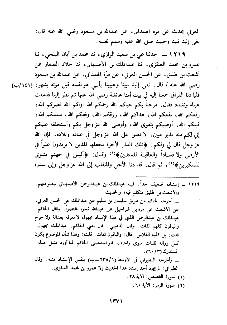 1219- حَدَّثَنَا عَلِيُّ بْنُ سَعِيدٍ الرَّازِيُّ، حَدَّثَنَا مُحَمَّدُ بْنُ أَبَانَ الْبَلْخِيُّ، حَدَّثَنَا عَمْرُو بْنُ مُحَمَّدٍ الْعَنْقَزِيُّ، حَدَّثَنَا عَبْدُ الْمَلِكِ بْنُ الأَصْبَهَانِيِّ، حَدَّثَنَا خَلاَّدٌ الصَّفَّارُ، عَنْ أَشْعَثَ بْنِ طَلِيقٍ، عَنِ الْحَسَنِ الْعُرَنِيِّ، عَنْ مُرَّةَ الْهَمْدَانِيِّ، عَنْ عَبْدِ اللهِ بْنِ مَسْعُودٍ، رَضِيَ اللَّهُ عَنْهُ قَالَ: نَعَى إِلَيْنَا نَبِيُّنَا وَحَبِيبُنَا بِأَبِي هُوَ نَفْسَهُ قَبْلَ مَوْتِهِ بِشَهْرٍ، فَلَمَّا دَنَا الْفِرَاقُ, جَمَعَنَا إِلَيْهِ فِي بَيْتِ أَمِّنَا عَائِشَةَ رَضِيَ اللَّهُ عَنْهَا، ثُمَّ نَظَرَ إِلَيْنَا, فَدَمَعَتْ عَيْنَاهُ وَتَشَدَّدَ, فَقَالَ: مَرْحَبًا بِكُمْ, حَيَّاكُمُ اللَّهُ، رَحِمَكُمُ اللَّهُ، آوَاكُمُ اللَّهُ، نَصَرَكُمُ اللَّهُ، رَفْعَكُمُ اللَّهُ، نَفَعَكُمُ اللَّهُ، هَدَاكُمُ اللَّهُ، رَزَقَكُمُ اللَّهُ، وَفَّقَكُمُ اللَّهُ، سَلَّمَكُمُ اللَّهُ، قَبِلَكُمُ اللَّهُ، أُوصِيكُمْ بِتَقْوَى اللهِ، وَأُوصِي اللَّهَ عَزَّ وَجَلَّ بِكُمْ،
