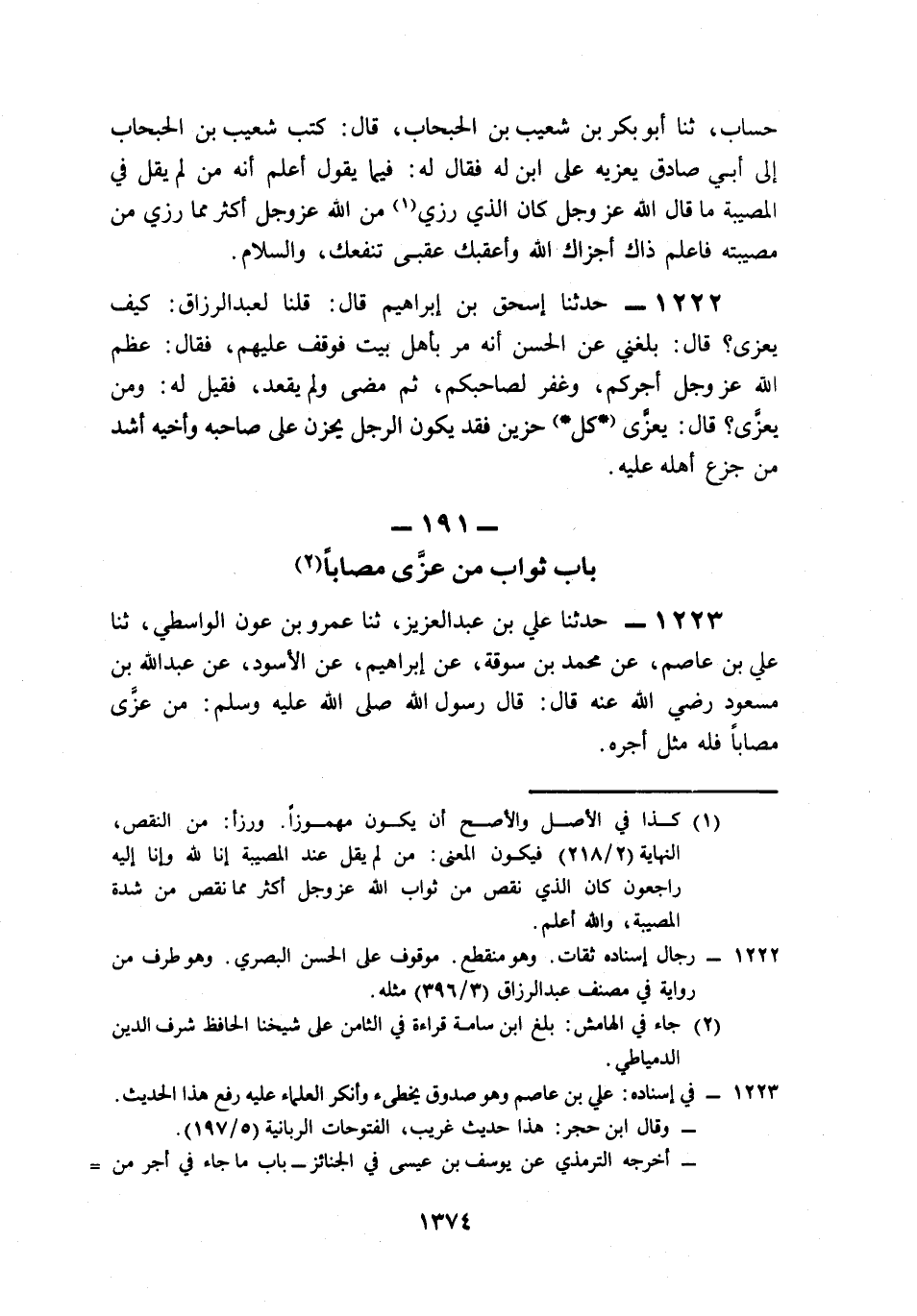 1222- حَدَّثَنَا إِسْحَاقُ بْنُ إِبْرَاهِيمَ، قَالَ: قُلْنَا لِعَبْدِ الرَّزَّاقِ: كَيْفَ يُعَزَّى؟ قَالَ: بَلَغَنِي عَنِ الْحَسَنِ أَنَّهُ مَرَّ بِأَهْلِ بَيْتٍ, فَوَقَفَ عَلَيْهِمْ فَقَالَ: عَظَّمَ اللَّهُ عَزَّ وَجَلَّ أَجْرَكُمْ, وَغَفَرَ لِصَاحِبِكُمْ, ثُمَّ مَضَى وَلَمْ يَقْعُدْ, فَقِيلَ لَهُ: وَمَنْ يُعَزَّى؟ قَالَ: يُعَزَّى كُلُّ حَزِينٍ، فَقَدْ يَكُونُ الرَّجُلُ يَحْزَنُ عَلَى صَاحِبِهِ وَأَخِيهِ أَشَدَّ مِنْ جَزْعِ أَهْلِهِ عَلَيْهِ.