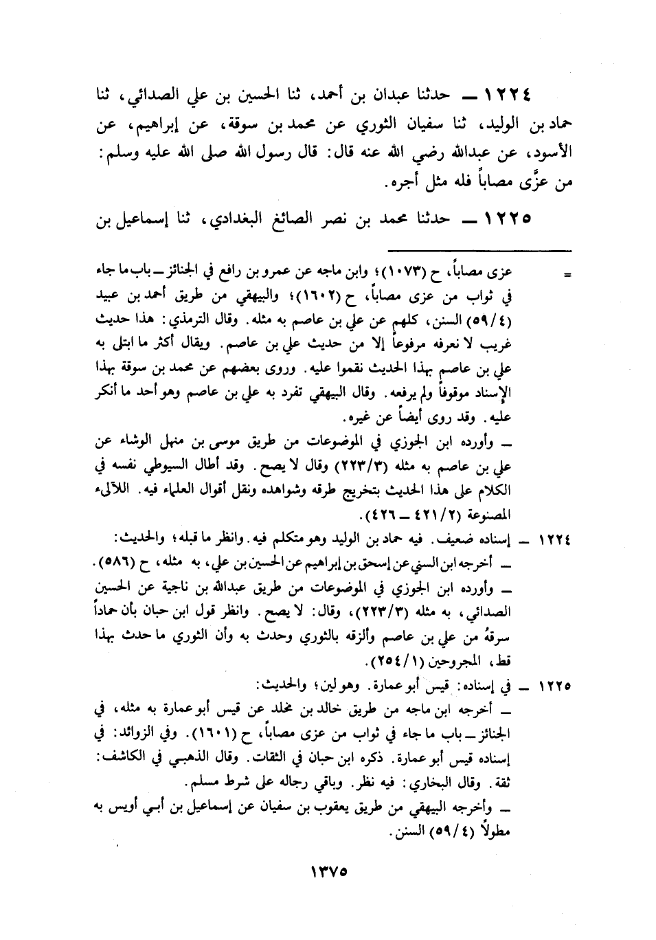 1224- حَدَّثَنَا عَبْدَانُ بْنُ أَحْمَدَ، حَدَّثَنَا الْحُسَيْنُ بْنُ عَلِيٍّ الصُّدَائِيُّ، حَدَّثَنَا حَمَّادُ بْنُ الْوَلِيدِ، حَدَّثَنَا سُفْيَانُ الثَّوْرِيُّ، عَنْ مُحَمَّدِ بْنِ سُوقَةَ، عَنْ إِبْرَاهِيمَ، عَنِ الأَسْوَدِ، عَنْ عَبْدِ اللهِ، رَضِيَ اللَّهُ عَنْهُ قَالَ: قَالَ رَسُولُ اللهِ صَلى الله عَلَيه وَسَلم: مَنْ عَزَّى مُصَابًا فَلَهُ مِثْلُ أَجْرِهِ.