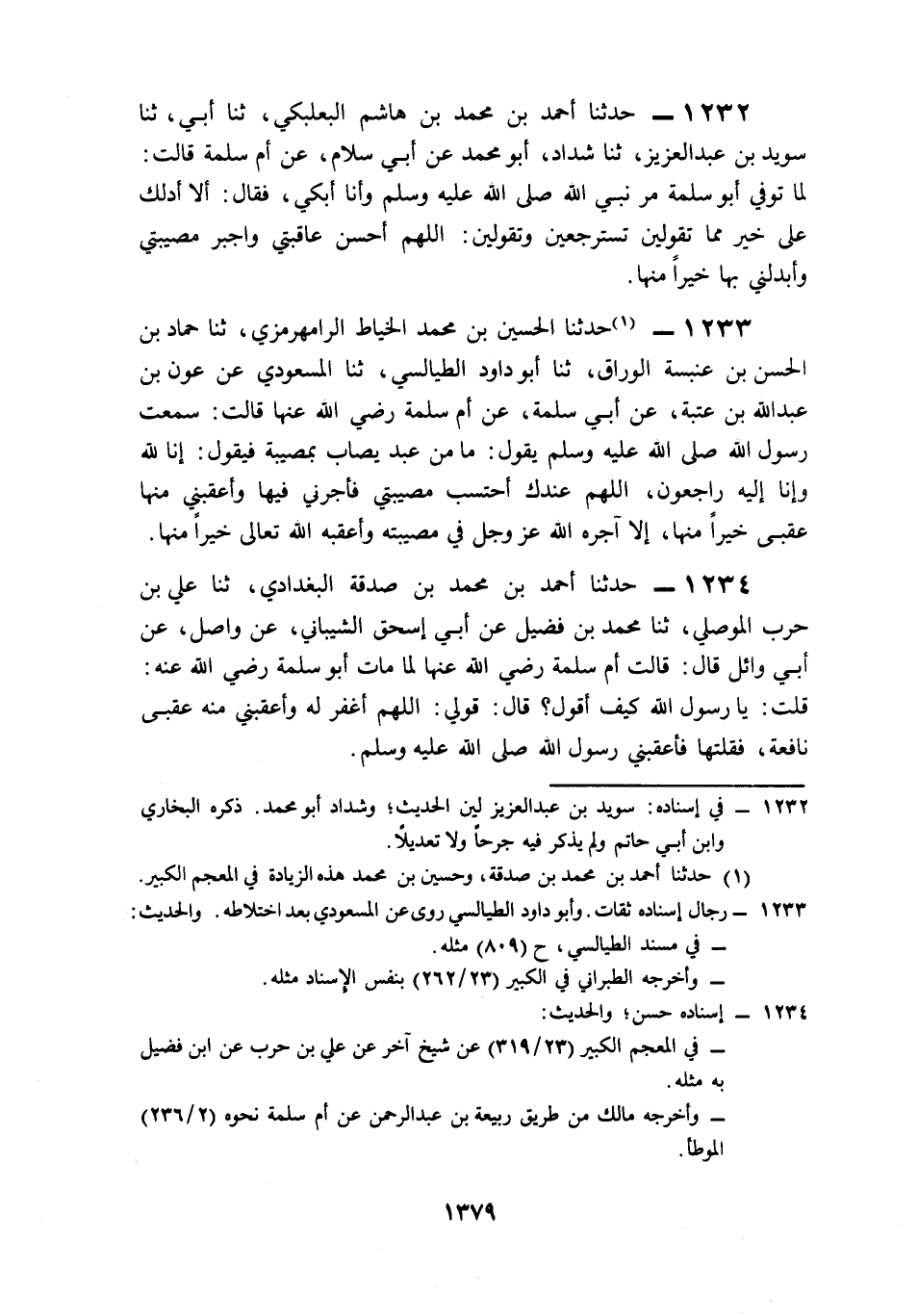 1232- حَدَّثَنَا أَحْمَدُ بْنُ مُحَمَّدِ بْنِ هَاشِمٍ الْبَعْلَبَكِّيُّ، حَدَّثَنَا أَبِي، حَدَّثَنَا سُوَيْدُ بْنُ عَبْدِ الْعَزِيزِ، حَدَّثَنَا شَدَّادٌ, أَبُو مُحَمَّدٍ، عَنْ أَبِي سَلاَّمٍ، عَنْ أُمِّ سَلَمَةَ، قَالَتْ: لَمَّا تُوُفِّيَ أَبُو سَلَمَةَ, مَرَّ نَبِيُّ اللهِ صَلى الله عَلَيه وَسَلم وَأَنَا أَبْكِي، فَقَالَ: أَلاَ أَدُلُّكِ عَلَى خَيْرٍ مِمَّا تَقُولِينَ، تَسْتَرْجِعِينَ, وَتَقُولِينَ: اللَّهُمَّ أَحْسِنْ عَاقِبَتِي، وَاجْبُرْ مُصِيبَتِي، وَأَبْدِلْنِي بِهَا خَيْرًا مِنْهَا.