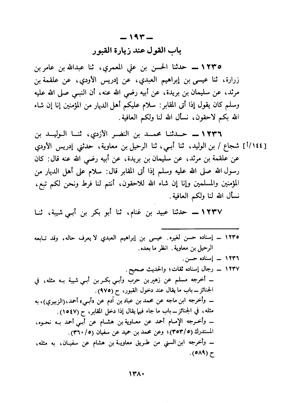 1236- حَدَّثَنَا مُحَمَّدُ بْنُ النَّضْرِ الأَزْدِيُّ، حَدَّثَنَا الْوَلِيدُ بْنُ شُجَاعِ بْنِ الْوَلِيدِ، حَدَّثَنَا أَبِي، حَدَّثَنَا الرُّحَيْلُ بْنُ مُعَاوِيَةَ، حَدَّثَنِي إِدْرِيسُ الأَوْدِيُّ، عَنْ عَلْقَمَةَ بْنِ مَرْثَدٍ، عَنْ سُلَيْمَانَ بْنِ بُرَيْدَةَ، عَنْ أَبِيهِ، رَضِيَ اللَّهُ عَنْهُ قَالَ: كَانَ رَسُولُ اللهِ صَلى الله عَلَيه وَسَلم إِذَا أَتَى الْمَقَابِرَ قَالَ: سَلاَمٌ عَلَى أَهْلِ الدِّيَارِ مِنَ الْمُؤْمِنِينَ وَالْمُسْلِمِينَ، وَإِنَّا إِنْ شَاءَ اللَّهُ لَلاَحِقُونَ، أَنْتُمْ لَنَا فَرَطٌ, وَنَحْنُ لَكُمْ تَبَعٌ, نَسْأَلُ اللَّهَ لَنَا وَلَكُمُ الْعَافِيَةَ.