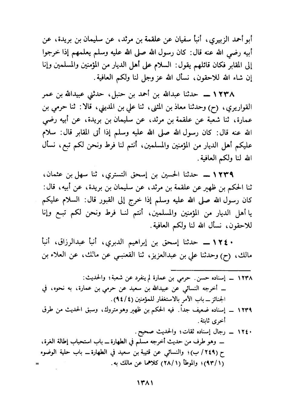 1238- حَدَّثَنَا عَبْدُ اللهِ بْنُ أَحْمَدَ بْنِ حَنْبَلٍ، حَدَّثَنِي عُبَيْدُ اللهِ بْنُ عُمَرَ الْقَوَارِيرِيُّ (ح) وَحَدَّثَنَا مُعَاذُ بْنُ الْمُثَنَّى، حَدَّثَنَا عَلِيُّ بْنُ الْمَدِينِيِّ، قَالاَ: حَدَّثَنَا حَرَمِيُّ بْنُ عُمَارَةَ، حَدَّثَنَا شُعْبَةُ، عَنْ عَلْقَمَةَ بْنِ مَرْثَدٍ، عَنْ سُلَيْمَانَ بْنِ بُرَيْدَةَ، عَنْ أَبِيهِ، رَضِيَ اللَّهُ عَنْهُ قَالَ: كَانَ رَسُولُ اللهِ صَلى الله عَلَيه وَسَلم إِذَا أَتَى الْمَقَابِرَ قَالَ: سَلاَمٌ عَلَيْكُمْ أَهْلَ الدِّيَارِ مِنَ الْمُؤْمِنِينَ وَالْمُسْلِمِينَ، أَنْتُمْ لَنَا فَرَطٌ وَنَحْنُ لَكُمْ تَبَعٌ، نَسْأَلُ اللَّهَ لَنَا وَلَكُمُ الْعَافِيَةَ.