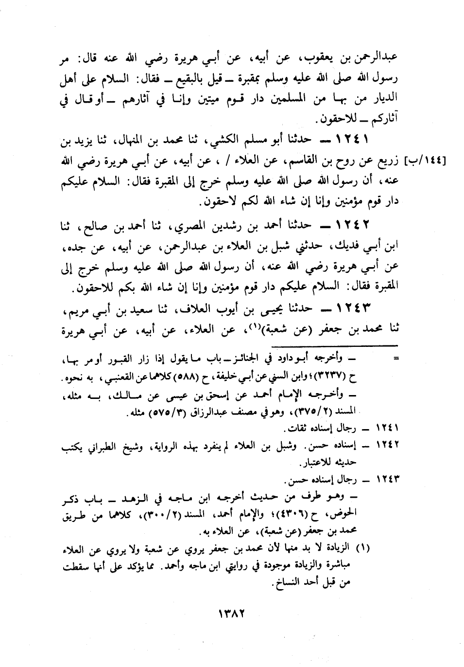 1242- حَدَّثَنَا أَحْمَدُ بْنُ رِشْدِينَ الْمِصْرِيُّ، حَدَّثَنَا أَحْمَدُ بْنُ صَالِحٍ، حَدَّثَنَا ابْنُ أَبِي فُدَيْكٍ، حَدَّثَنِي شِبْلُ بْنُ الْعَلاَءِ بْنِ عَبْدِ الرَّحْمَنِ، عَنْ أَبِيهِ، عَنْ جَدِّهِ، عَنْ أَبِي هُرَيْرَةَ، رَضِيَ اللَّهُ عَنْهُ, أَنَّ رَسُولَ اللهِ صَلى الله عَلَيه وَسَلم خَرَجَ إِلَى الْمَقْبَرَةِ فَقَالَ: السَّلاَمُ عَلَيْكُمْ دَارَ قَوْمٍ مُؤْمِنِينَ، وَإِنَّا إِنْ شَاءَ اللَّهُ بِكُمْ لَلاَحِقُونَ.