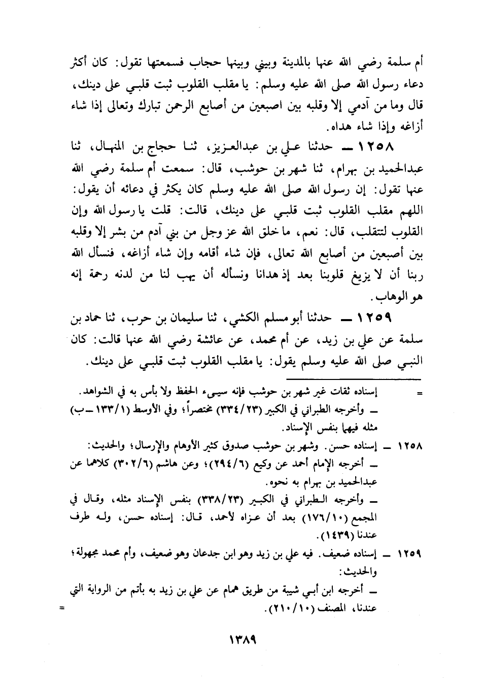 1258- حَدَّثَنَا عَلِيُّ بْنُ عَبْدِ الْعَزِيزِ، حَدَّثَنَا حَجَّاجُ بْنُ الْمِنْهَالِ، حَدَّثَنَا عَبْدُ الْحَمِيدِ بْنُ بَهْرَامَ، حَدَّثَنَا شَهْرُ بْنُ حَوْشَبٍ، قَالَ: سَمِعْتُ أُمَّ سَلَمَةَ، رَضِيَ اللَّهُ عَنْهَا تَقُولُ: إِنَّ رَسُولَ اللهِ صَلى الله عَلَيه وَسَلم كَانَ يُكْثِرُ فِي دُعَائِهِ أَنْ يَقُولَ: اللَّهُمَّ مُقَلِّبَ الْقُلُوبِ ثَبِّتْ قَلْبِي عَلَى دِينِكَ, قَالَتْ: قُلْتُ: يَا رَسُولَ اللهِ, وَإِنَّ الْقُلُوبَ لَتَتَقَلَّبُ؟ قَالَ: نَعَمْ، مَا خَلَقَ اللَّهُ عَزَّ وَجَلَّ مِنْ بَنِي آدَمَ مِنْ بِشْرٍ, إِلاَّ وَقَلْبُهُ بَيْنَ أُصْبُعَيْنِ مِنْ أَصَابِعِ اللهِ تَعَالَى، فَإِنْ شَاءَ أَقَامَهُ، وَإِنْ شَاءَ أَزَاغَهُ، فَنَسْأَلُ اللَّهَ رَبَّنَا أَنْ لاَ يُزِيغَ قُلُوبَنَا بَعْدَ إِذْ هَدَانَا، وَنَسْأَلُهُ أَنْ يَهَبَ لَنَا مِنْ لَدُنْهُ رَحْمَةً, إِنَّهُ هُوَ الْوَهَّابُ.