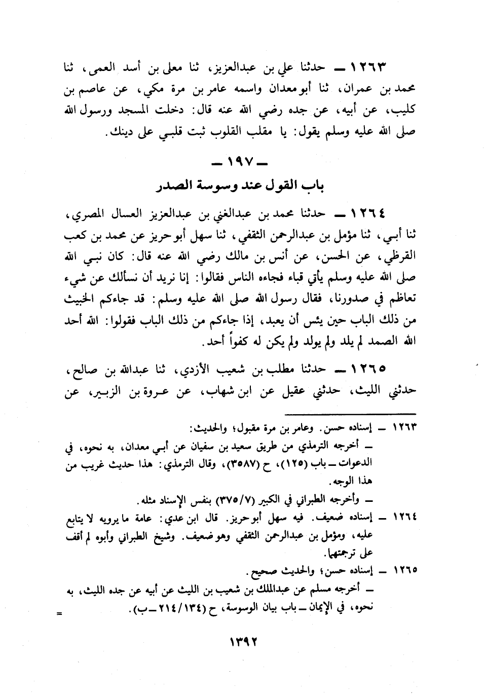 1264- حَدَّثَنَا مُحَمَّدُ بْنُ عَبْدِ الْغَنِيِّ بْنِ عَبْدِ الْعَزِيزِ الْعَسَّالُ الْمِصْرِيُّ، حَدَّثَنَا أَبِي، حَدَّثَنَا مُؤَمَّلُ بْنُ عَبْدِ الرَّحْمَنِ الثَّقَفِيُّ، حَدَّثَنَا سَهْلٌ, أَبُو حَرِيزٍ، عَنْ مُحَمَّدِ بْنِ كَعْبٍ الْقُرَظِيِّ، عَنِ الْحَسَنِ، عَنْ أَنَسِ بْنِ مَالِكٍ، رَضِيَ اللَّهُ عَنْهُ قَالَ: كَانَ نَبِيُّ اللهِ صَلى الله عَلَيه وَسَلم يَأْتِي قُبَاءَ, فَجَاءَهُ النَّاسُ, فَقَالُوا: إِنَّا نُرِيدُ أَنْ نَسْأَلَكَ عَنْ شَيْءٍ تَعَاظَمَ فِي صُدُورِنَا، فَقَالَ رَسُولُ اللهِ صَلى الله عَلَيه وَسَلم: قَدْ جَاءَكُمُ الْخَبِيثُ مِنْ ذَلِكَ الْبَابِ, حِينَ يَئِسَ أَنْ يَعْبُدَ، إِذَا جَاءَكُمْ مِنْ ذَلِكَ الْبَابِ فَقُولُوا: {اللَّهُ أَحَدٌ اللَّهُ الصَّمَدُ لَمْ يَلِدْ وَلَمْ يُولَدْ وَلَمْ يَكُنْ لَهُ كُفُوًا أَحَدٌ}.