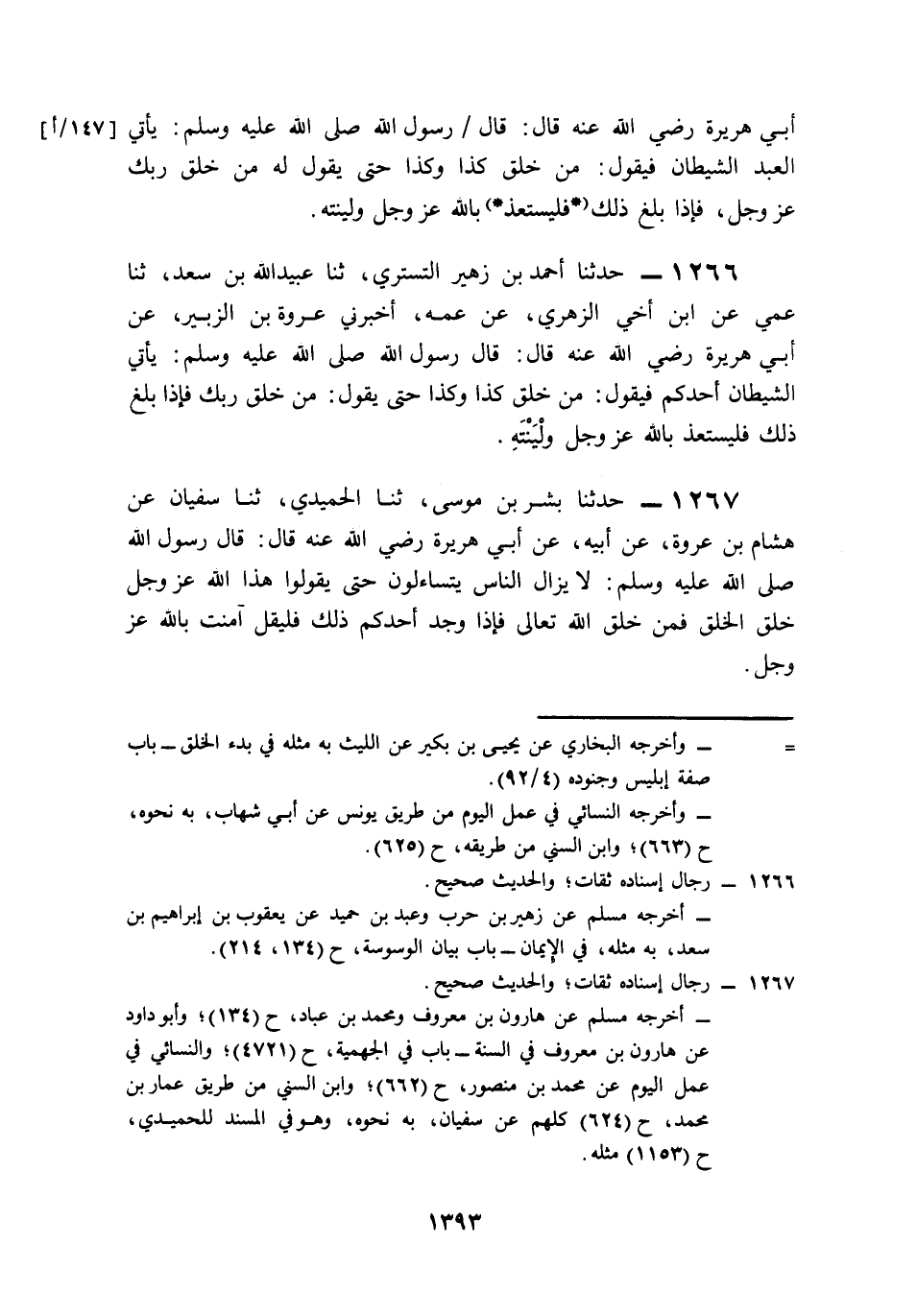 1266- حَدَّثَنَا أَحْمَدُ بْنُ زُهَيْرٍ التُّسْتَرِيُّ، حَدَّثَنَا عُبَيْدُ اللهِ بْنُ سَعْدٍ، حَدَّثَنَا عَمِّي، عَنِ ابْنِ أَخِي الزُّهْرِيِّ، عَنْ عَمِّهِ، أَخْبَرَنِي عُرْوَةُ بْنُ الزُّبَيْرِ، عَنْ أَبِي هُرَيْرَةَ، رَضِيَ اللَّهُ عَنْهُ قَالَ: قَالَ رَسُولُ اللهِ صَلى الله عَلَيه وَسَلم: يَأْتِي الشَّيْطَانُ أَحَدَكُمْ, فَيَقُولُ: مَنْ خَلَقَ كَذَا وَكَذَا؟ حَتَّى يَقُولَ مِنْ خَلَقَ رَبَّكَ، فَإِذَا بَلَغَ ذَلِكَ, فَلْيَسْتَعِذْ بِاللهِ عَزَّ وَجَلَّ وَلْيَنْتَهِ.