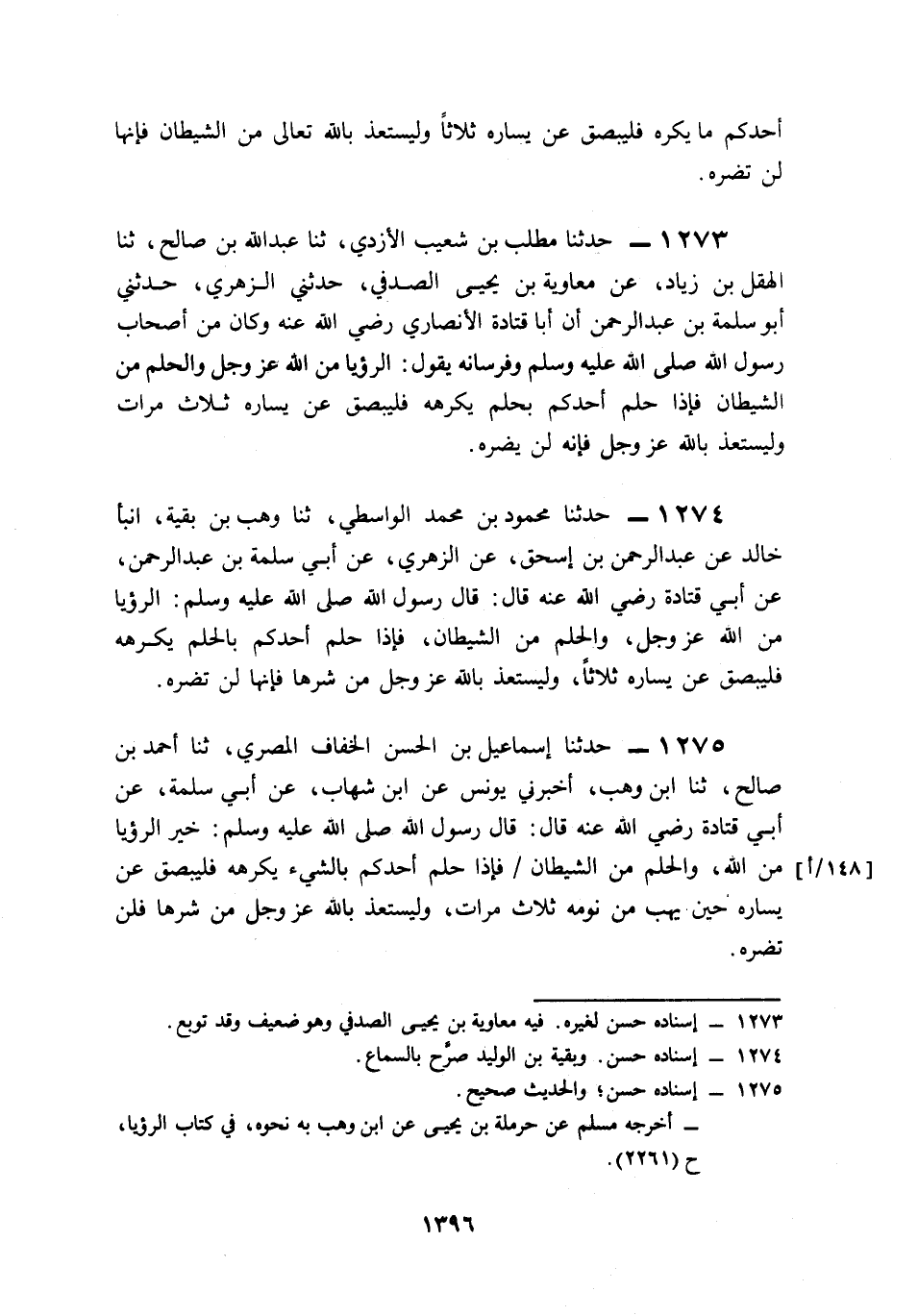 1273- حَدَّثَنَا مُطَّلِبُ بْنُ شُعَيْبٍ الأَزْدِيُّ، حَدَّثَنَا عَبْدُ اللهِ بْنُ صَالِحٍ، حَدَّثَنَا الْهِقْلُ بْنُ زِيَادٍ، عَنْ مُعَاوِيَةَ بْنِ يَحْيَى الصَّدَفِيِّ، حَدَّثَنِي الزُّهْرِيُّ، حَدَّثَنِي أَبُو سَلَمَةَ بْنُ عَبْدِ الرَّحْمَنِ، أَنَّ أَبَا قَتَادَةَ الأَنْصَارِيَّ، رَضِيَ اللَّهُ عَنْهُ, وَكَانَ مِنْ أَصْحَابِ رَسُولِ اللهِ صَلى الله عَلَيه وَسَلم وَفُرْسَانِهِ يَقُولُ: الرُّؤْيَا مِنَ اللهِ عَزَّ وَجَلَّ، وَالْحُلْمُ مِنَ الشَّيْطَانِ، فَإِذَا حَلَمَ أَحَدُكُمْ بِحُلْمٍ يَكْرَهُهُ, فَلْيَبْصُقْ عَنْ يَسَارِهِ ثَلاَثَ مَرَّاتٍ, وَلْيَسْتَعِذْ بِاللهِ عَزَّ وَجَلَّ, فَإِنَّهُ لَنْ يَضُرَّهُ.