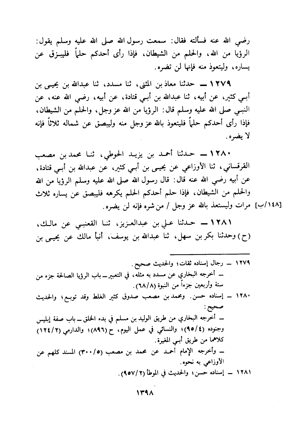 1279- حَدَّثَنَا مُعَاذُ بْنُ الْمُثَنَّى، حَدَّثَنَا مُسَدَّدٌ، حَدَّثَنَا عَبْدُ اللهِ بْنُ يَحْيَى بْنِ أَبِي كَثِيرٍ، عَنْ أَبِيهِ، حَدَّثَنَا عَبْدُ اللهِ بْنُ أَبِي قَتَادَةَ، عَنْ أَبِيهِ، رَضِيَ اللَّهُ عَنْهُ, عَنِ النَّبِيِّ صَلى الله عَلَيه وَسَلم قَالَ: الرُّؤْيَا مِنَ اللهِ عَزَّ وَجَلَّ، وَالْحُلْمُ مِنَ الشَّيْطَانِ، فَإِذَا رَأَى أَحَدُكُمْ حُلْمًا, فَلْيَتَعَوَّذْ بِاللهِ عَزَّ وَجَلَّ مِنْهُ, وَلْيَبْصُقْ عَنْ شِمَالِهِ ثَلاَثًا, فَإِنَّهُ لاَ يَضُرُّهُ.
