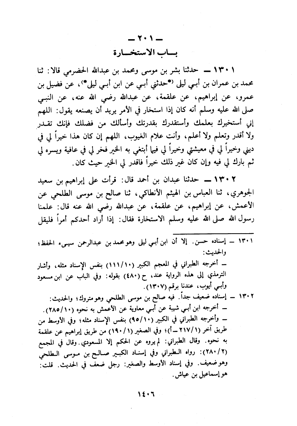 1301- حَدَّثَنَا بِشْرُ بْنُ مُوسَى، وَمُحَمَّدُ بْنُ عَبْدِ اللهِ الْحَضْرَمِيُّ، قَالاَ: حَدَّثَنَا مُحَمَّدُ بْنُ عِمْرَانَ بْنِ أَبِي لَيْلَى، حَدَّثَنِي أَبِي، عَنِ ابْنِ أَبِي لَيْلَى، عَنْ فُضَيْلِ بْنِ عَمْرٍو، عَنْ إِبْرَاهِيمَ، عَنْ عَلْقَمَةَ، عَنْ عَبْدِ اللهِ، رَضِيَ اللَّهُ عَنْهُ, عَنِ النَّبِيِّ صَلى الله عَلَيه وَسَلم أَنَّهُ كَانَ إِذَا اسْتَخَارَ فِي الأَمْرِ يُرِيدُ أَنْ يَصْنَعَهُ يَقُولُ: اللَّهُمَّ إِنِّي أَسْتَخِيرُكَ بِعِلْمِكَ، وَأَسْتَقْدِرُكَ بِقُدْرَتِكَ، وَأَسْأَلُكَ مِنْ فَضْلِكَ، فَإِنَّكَ تَقْدِرُ وَلاَ أَقْدِرُ، وَتَعْلَمُ وَلاَ أَعْلَمُ، وَأَنْتَ عَلاَّمُ الْغُيُوبِ، اللَّهُمَّ إِنْ كَانَ هَذَا خَيْرًا لِي فِي دِينِي، وَخَيْرًا لِي فِي مَعِيشَتِي، وَخَيْرًا لِي فِيمَا أَبْتَغِي بِهِ الْخَيْرَ، فَخِرْ لِي فِي عَافِيَةٍ, وَيَسِّرْهُ لِي، ثُمَّ بَارِكْ لِي فِيهِ، وَإِنْ كَانَ غَيْرَ ذَلِكَ خَيْرًا فَاقْدُرْ لِيَ الْخَيْرَ حَيْثُ كَانَ.