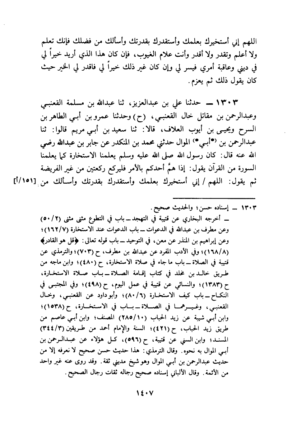 1303- حَدَّثَنَا عَلِيُّ بْنُ عَبْدِ الْعَزِيزِ، حَدَّثَنَا عَبْدُ اللهِ بْنُ مَسْلَمَةَ الْقَعْنَبِيُّ، وَعَبْدُ الرَّحْمَنِ بْنُ مُقَاتِلٍ, خَالُ الْقَعْنَبِيِّ (ح) وَحَدَّثَنَا عَمْرُو بْنُ أَبِي الطَّاهِرِ بْنِ السَّرْحِ، وَيَحْيَى بْنُ أَيُّوبَ الْعَلاَّفُ، قَالاَ: حَدَّثَنَا سَعِيدُ بْنُ أَبِي مَرْيَمَ، قَالُوا: حَدَّثَنَا عَبْدُ الرَّحْمَنِ بْنُ أَبِي الْمَوَالِ، حَدَّثَنِي مُحَمَّدُ بْنُ الْمُنْكَدِرِ، عَنْ جَابِرِ بْنِ عَبْدِ اللهِ، رَضِيَ اللَّهُ عَنْهُ قَالَ: كَانَ رَسُولُ اللهِ صَلى الله عَلَيه وَسَلم يُعَلِّمُنَا الِاسْتِخَارَةَ كَمَا يُعَلِّمُنَا السُّورَةَ مِنَ الْقُرْآنِ يَقُولُ: إِذَا هَمَّ أَحَدُكُمْ بِالأَمْرِ, فَلْيَرْكَعْ رَكْعَتَيْنِ مِنْ غَيْرِ الْفَرِيضَةِ، ثُمَّ يَقُولُ: اللَّهُمَّ إِنِّي أَسْتَخِيرُكَ بِعِلْمِكَ، وَأَسْتَقْدِرُكَ بِقُدْرَتِكَ، وَأَسْأَلُكَ مِنْ فَضْلِكَ، فَإِنَّكَ تَعْلَمُ وَلاَ أَعْلَمُ، وَتَقْدِرُ وَلاَ أَقْدِرُ، وَأَنْتَ عَلاَّمُ الْغُيُوبِ، اللَّهُمَّ إِنْ كُنْتَ تَعْلَمُ هَذَا الأَمْرَ خَيْرًا لِي فِي دِينِي وَمَعَاشِي وَعَاقِبَةِ أَمْرِي، أَوْ فِي عَاجِلِ أَمْرِي وَآجِلِهِ, فَاقْدُرْهُ لِي وَيَسِّرْهُ لِي، وَإِنْ كُنْتَ تَعْلَمُ هَذَا الأَمْرَ شَرًّا لِي فِي دِينِي وَمَعَاشِي, وَعَاقِبَةِ أَمْرِي, أَوْ فِي عَاجِلِ أَمْرِي وَآجِلِهِ, فَاصْرِفْهُ عَنِّي, وَاصْرِفْنِي عَنْهُ، وَاقْدُرْ لِيَ الْخَيْرَ حَيْثُ كَانَ, وَرَضِّنِي بِهِ, وَيُسَمِّي حَاجَتَهُ بِاسْمِهَا.