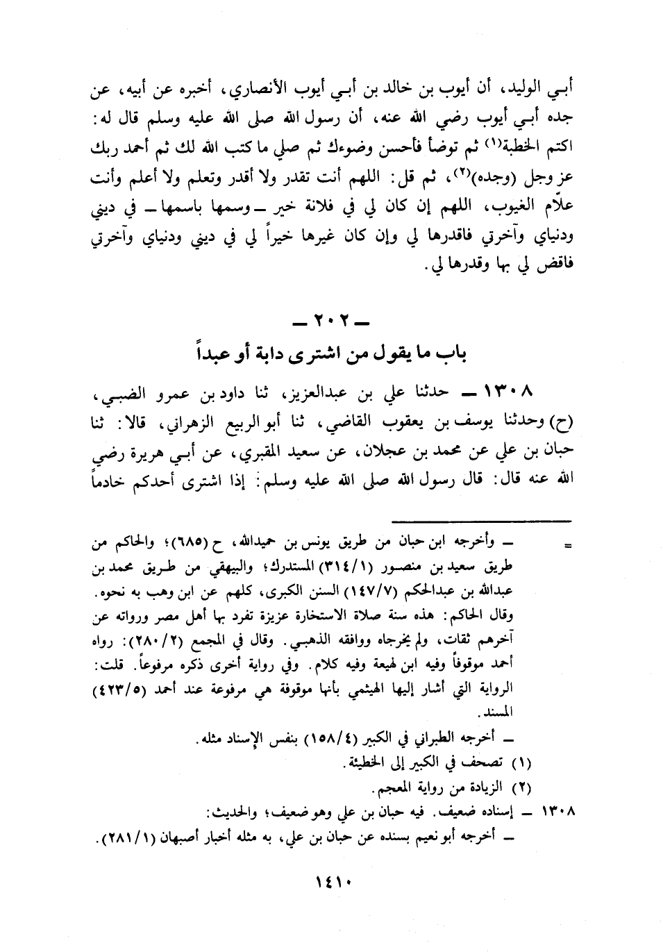 1308- حَدَّثَنَا عَلِيُّ بْنُ عَبْدِ الْعَزِيزِ، حَدَّثَنَا دَاوُدُ بْنُ عَمْرٍو الضَّبِّيُّ (ح) وَحَدَّثَنَا يُوسُفُ بْنُ يَعْقُوبَ الْقَاضِي، حَدَّثَنَا أَبُو الرَّبِيعِ الزَّهْرَانِيُّ، قَالاَ: حَدَّثَنَا حَبَّانُ بْنُ عَلِيٍّ، عَنْ مُحَمَّدِ بْنِ عَجْلاَنَ، عَنْ سَعِيدٍ الْمَقْبُرِيِّ، عَنْ أَبِي هُرَيْرَةَ، رَضِيَ اللَّهُ عَنْهُ قَالَ: قَالَ رَسُولُ اللهِ صَلى الله عَلَيه وَسَلم: إِذَا اشْتَرَى أَحَدُكُمْ خَادِمًا, فَلْيَأْخُذْ بِنَاصِيَتِهَا, وَلْيَقُلِ: اللَّهُمَّ إِنِّي أَسْأَلُكَ مِنْ خَيْرِهَا, وَخَيْرِ مَا جَبَلْتَهَا عَلَيْهِ، وَإِذَا اشْتَرَى دَابَّةً, فَلْيَأْخُذْ بِنَاصِيَتِهَا, وَلْيَقُلِ: اللَّهُمَّ إِنِّي أَسْأَلُكَ مِنْ خَيْرِهَا, وَخَيْرِ مَا جَبَلْتَهَا عَلَيْهِ، وَإِذَا اشْتَرَى بَعِيرًا, فَلْيَأْخُذْ بِذِرْوَةِ سَنَامِهِ, وَلْيَقُلْ مِثْلَ ذَلِكَ.
