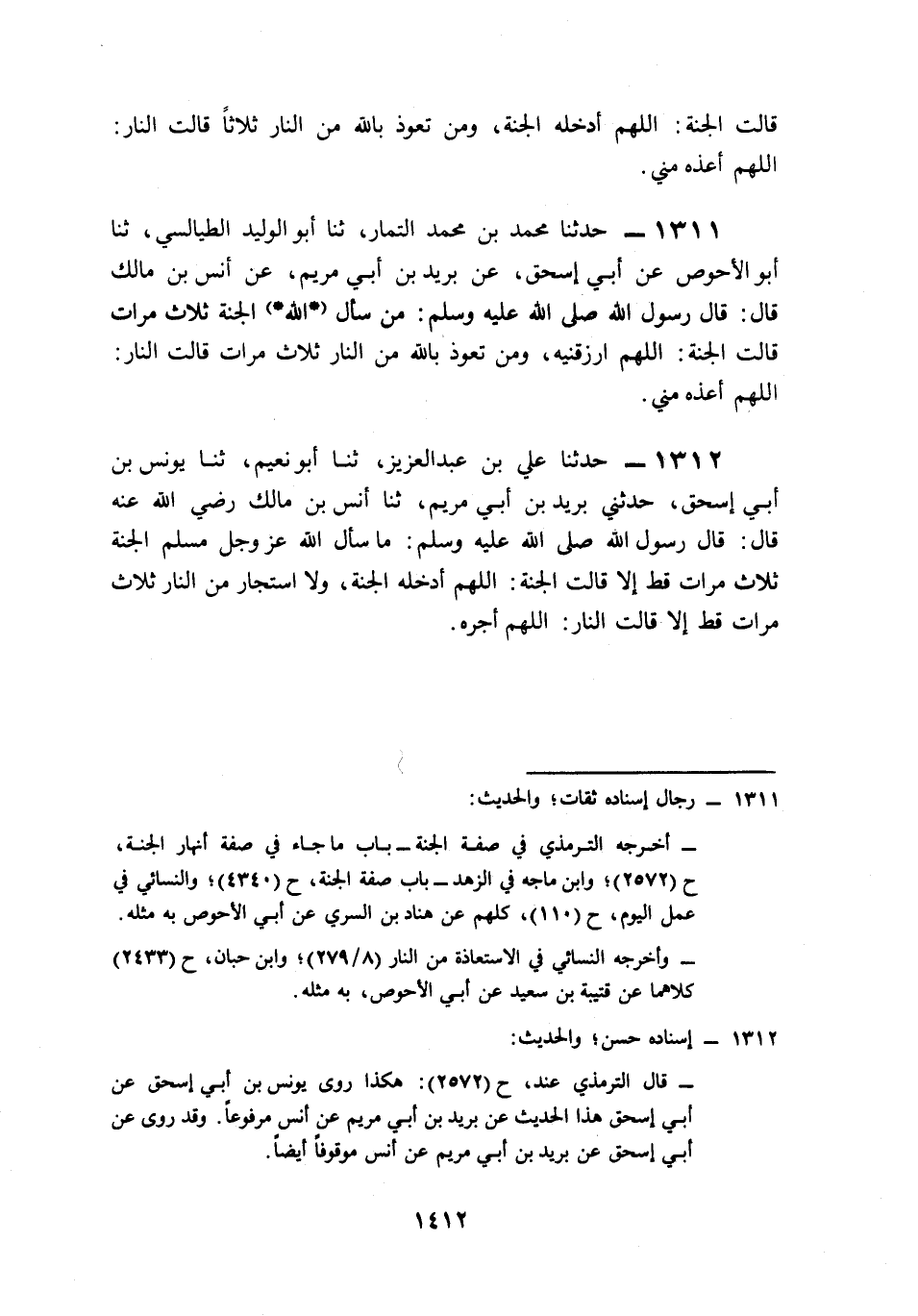 1311- حَدَّثَنَا مُحَمَّدُ بْنُ مُحَمَّدٍ التَّمَّارُ، حَدَّثَنَا أَبُو الْوَلِيدِ الطَّيَالِسِيُّ، حَدَّثَنَا أَبُو الأَحْوَصِ، عَنْ أَبِي إِسْحَاقَ، عَنْ بُرَيْدِ بْنِ أَبِي مَرْيَمَ، عَنْ أَنَسِ بْنِ مَالِكٍ، قَالَ: قَالَ رَسُولُ اللهِ صَلى الله عَلَيه وَسَلم: مَنْ سَأَلَ اللَّهَ الْجَنَّةَ ثَلاَثَ مَرَّاتٍ, قَالَتِ الْجَنَّةُ: اللَّهُمَّ ارْزُقْنِيهِ، وَمَنْ تَعَوَّذَ بِاللهِ مِنَ النَّارِ ثَلاَثَ مَرَّاتٍ, قَالَتِ النَّارُ: اللَّهُمَّ أَعِذْهُ مِنِّي.