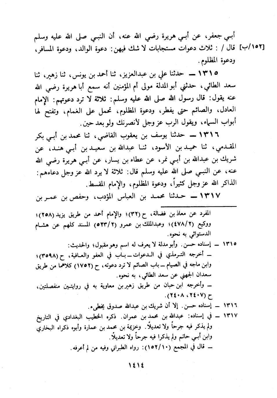 1316- حَدَّثَنَا يُوسُفُ بْنُ يَعْقُوبَ الْقَاضِي، حَدَّثَنَا مُحَمَّدُ بْنُ أَبِي بَكْرٍ الْمُقَدَّمِيُّ، حَدَّثَنَا حُمَيْدُ بْنُ الأَسْوَدِ، حَدَّثَنَا عَبْدُ اللهِ بْنُ سَعِيدِ بْنِ أَبِي هِنْدٍ، عَنْ شَرِيكِ بْنِ عَبْدِ اللهِ بْنِ أَبِي نَمِرٍ، عَنْ عَطَاءِ بْنِ يَسَارٍ، عَنْ أَبِي هُرَيْرَةَ، رَضِيَ اللَّهُ عَنْهُ, عَنِ النَّبِيِّ صَلى الله عَلَيه وَسَلم قَالَ: ثَلاَثَةٌ لاَ يَرُدُّ اللَّهُ عَزَّ وَجَلَّ دُعَاءَهُمُ: الذَّاكِرُ اللَّهَ عَزَّ وَجَلَّ كَثِيرًا، وَدَعْوَةُ الْمَظْلُومِ، وَالإِمَامُ الْمُقْسِطُ.
