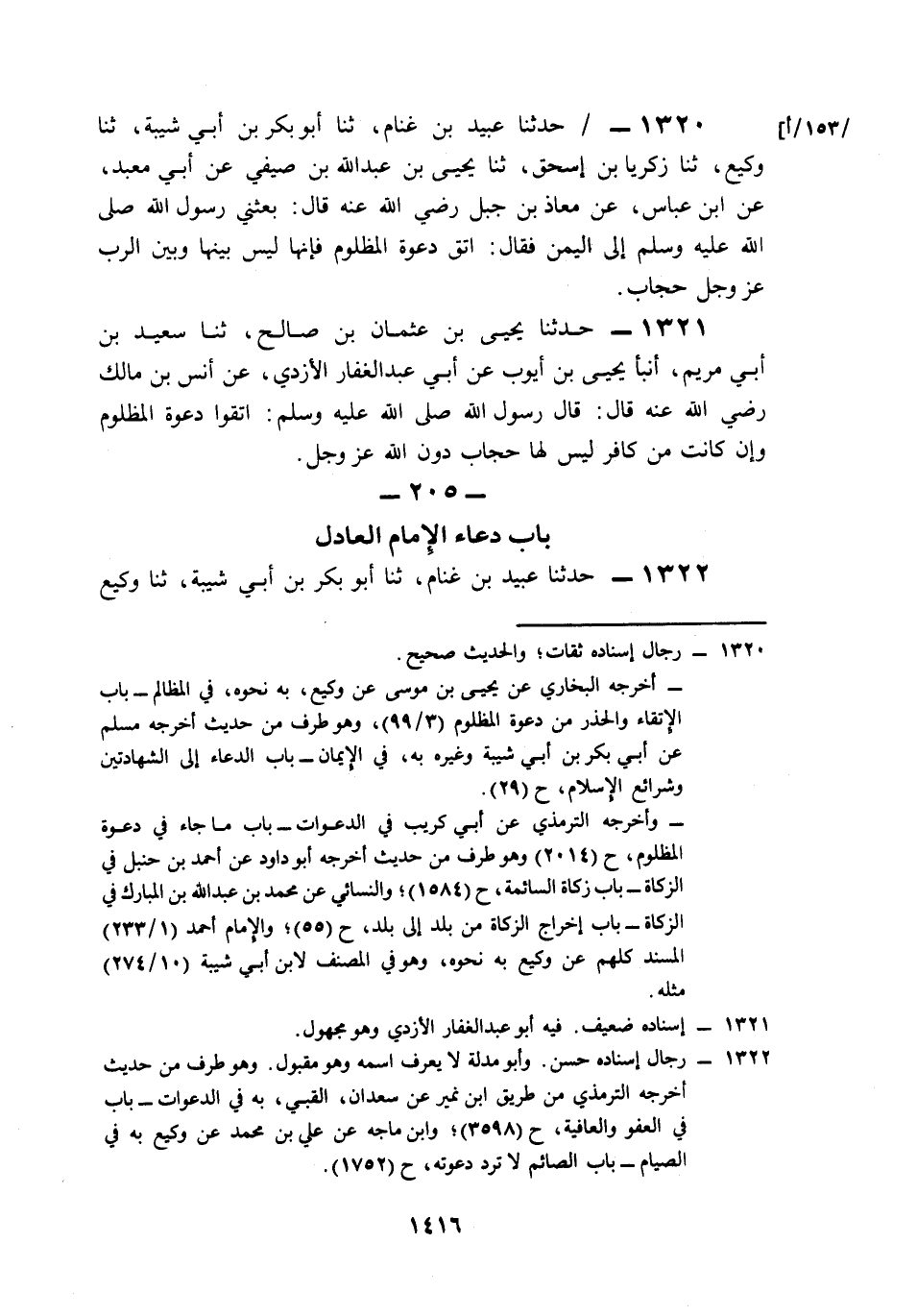 1320- حَدَّثَنَا عُبَيْدُ بْنُ غَنَّامٍ، حَدَّثَنَا أَبُو بَكْرِ بْنُ أَبِي شَيْبَةَ، حَدَّثَنَا وَكِيعٌ، حَدَّثَنَا زَكَرِيَّا بْنُ إِسْحَاقَ، حَدَّثَنَا يَحْيَى بْنُ عَبْدِ اللهِ بْنِ صَيْفِيٍّ، عَنْ أَبِي مَعْبَدٍ، عَنِ ابْنِ عَبَّاسٍ، عَنْ مُعَاذِ بْنِ جَبَلٍ، رَضِيَ اللَّهُ عَنْهُ قَالَ: بَعَثَنِي رَسُولُ اللهِ صَلى الله عَلَيه وَسَلم إِلَى الْيَمَنِ فَقَالَ: اتَّقِ دَعْوَةَ الْمَظْلُومِ, فَإِنَّهَا لَيْسَ بَيْنَهَا وَبَيْنَ الرَّبِّ عَزَّ وَجَلَّ حِجَابٌ.