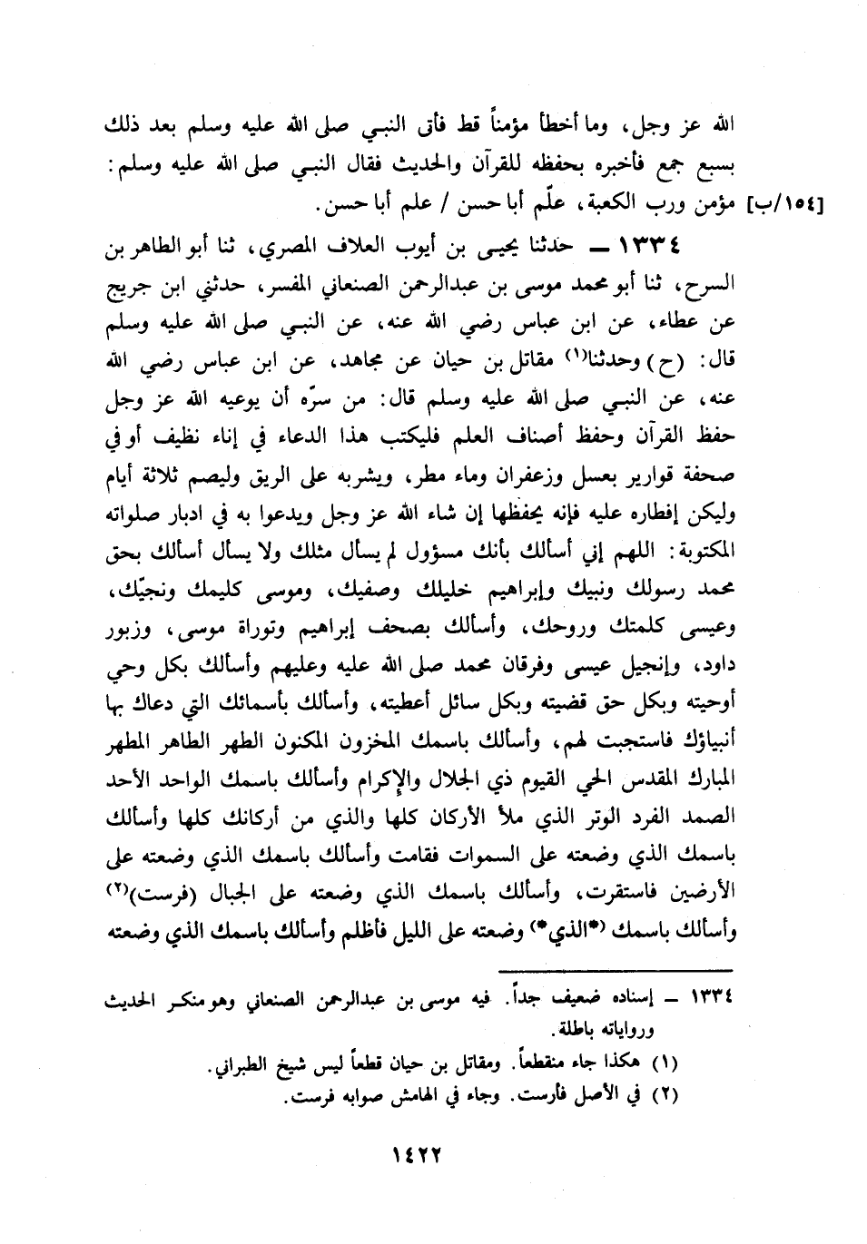 1334- حَدَّثَنَا يَحْيَى بْنُ أَيُّوبَ الْعَلاَّفُ الْمِصْرِيُّ، حَدَّثَنَا أَبُو طَاهِرِ بْنُ السَّرْحِ، حَدَّثَنَا أَبُو مُحَمَّدٍ مُوسَى بْنُ عَبْدِ الرَّحْمَنِ الصَّنْعَانِيُّ الْمُفَسِّرُ، حَدَّثَنِي ابْنُ جُرَيْجٍ، عَنْ عَطَاءٍ، عَنِ ابْنِ عَبَّاسٍ، رَضِيَ اللَّهُ عَنْهُ, عَنِ النَّبِيِّ صَلى الله عَلَيه وَسَلم قَال (ح) وَحَدَّثَنَا مُقَاتِلُ بْنُ حَيَّانَ، عَنْ مُجَاهِدٍ، عَنِ ابْنِ عَبَّاسٍ، رَضِيَ اللَّهُ عَنْهُ, عَنِ النَّبِيِّ صَلى الله عَلَيه وَسَلم قَالَ: مَنْ سَرَّهُ أَنْ يُوعِيَهُ اللَّهُ عَزَّ وَجَلَّ حِفْظَ الْقُرْآنِ وَحِفْظَ أَصْنَافِ الْعِلْمِ, فَلْيَكْتُبْ هَذَا الدُّعَاءَ فِي إِنَاءٍ نَظِيفٍ, أَوْ فِي صَحْفَةِ قَوَارِيرَ بِعَسَلٍ وَزَعْفَرَانٍ وَمَاءِ مَطَرٍ, وَيَشْرَبُهُ عَلَى الرِّيقِ, وَلْيَصُمْ ثَلاَثَةَ أَيَّامٍ، وَلْيَكُنْ إِفْطَارُهُ عَلَيْهِ,
