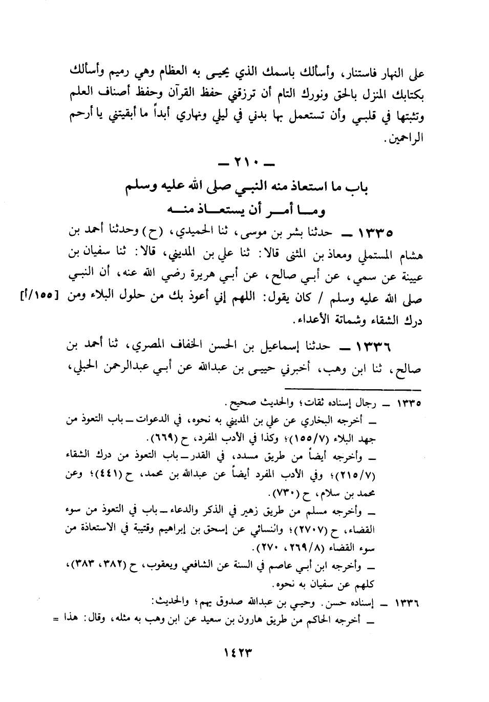 1335- حَدَّثَنَا بِشْرُ بْنُ مُوسَى، حَدَّثَنَا الْحُمَيْدِيُّ (ح) وَحَدَّثَنَا أَحْمَدُ بْنُ هِشَامٍ الْمُسْتَمْلِي، وَمُعَاذُ بْنُ الْمُثَنَّى، قَالاَ: حَدَّثَنَا عَلِيُّ بْنُ الْمَدِينِيِّ، قَالاَ: حَدَّثَنَا سُفْيَانُ بْنُ عُيَيْنَةَ، عَنْ سُمَيٍّ، عَنْ أَبِي صَالِحٍ، عَنْ أَبِي هُرَيْرَةَ، رَضِيَ اللَّهُ عَنْهُ, أَنَّ النَّبِيَّ صَلى الله عَلَيه وَسَلم كَانَ يَقُولُ: اللَّهُمَّ إِنِّي أَعُوذُ بِكَ مِنْ حُلُولِ الْبَلاَءِ، وَمِنْ دَرْكِ الشَّقَاءِ, وَشَمَاتَةِ الأَعْدَاءِ.