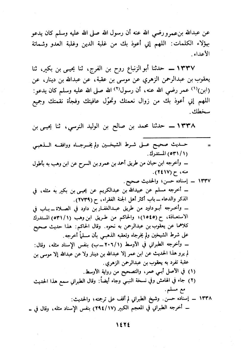 1337- حَدَّثَنَا أَبُو الزِّنْبَاعِ روح بْنُ الْفَرَجِ، حَدَّثَنَا يَحْيَى بْنُ بُكَيْرٍ، حَدَّثَنَا يَعْقُوبُ بْنُ عَبْدِ الرَّحْمَنِ الزُّهْرِيُّ، عَنْ مُوسَى بْنِ عُقْبَةَ، عَنْ عَبْدِ اللهِ بْنِ دِينَارٍ، عَنِ ابْنِ عُمَرَ، رَضِيَ اللَّهُ عَنْهُ, أَنَّ رَسُولَ اللهِ صَلى الله عَلَيه وَسَلم كَانَ يَدْعُو: اللَّهُمَّ إِنِّي أَعُوذُ بِكَ مِنْ زَوَالِ نِعْمَتِكَ، وَتَحَوُّلِ عَافِيَتِكَ، وَفَجْأَةِ نِقْمَتِكَ، وَجَمِيعِ سَخَطِكَ.