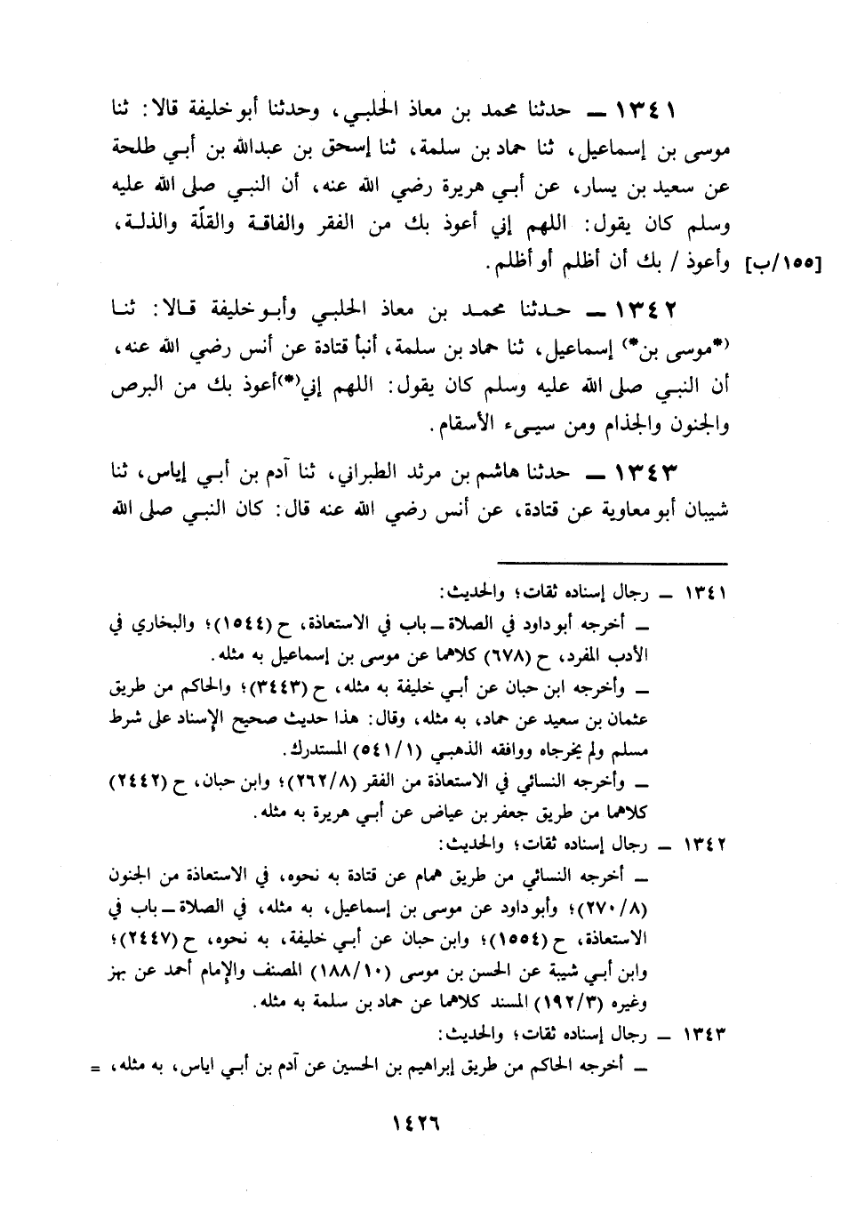 1342- حَدَّثَنَا مُحَمَّدُ بْنُ مُعَاذٍ الْحَلَبِيُّ، وَأَبُو خَلِيفَةَ, قَالاَ: حَدَّثَنَا مُوسَى بْنُ إِسْمَاعِيلَ، حَدَّثَنَا حَمَّادُ بْنُ سَلَمَةَ، أَخْبَرَنَا قَتَادَةُ، عَنْ أَنَسٍ، رَضِيَ اللَّهُ عَنْهُ, أَنَّ النَّبِيَّ صَلى الله عَلَيه وَسَلم كَانَ يَقُولُ: اللَّهُمَّ إِنِّي أَعُوذُ بِكَ مِنَ الْبَرَصِ وَالْجُنُونِ وَالْجُذَامِ, وَمِنْ سَيِّئِ الأَسْقَامِ.