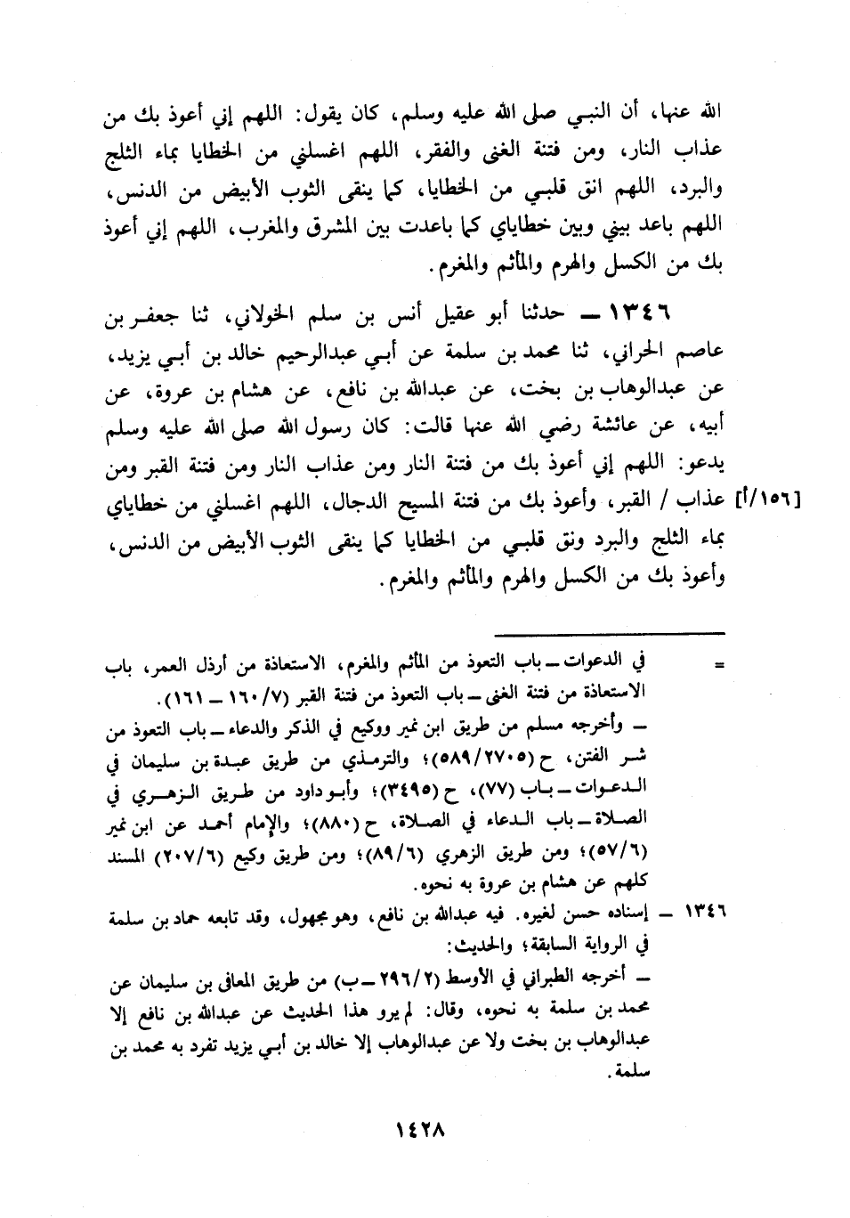 1346- حَدَّثَنَا أَبُو عَقِيلٍ أَنَسُ بْنُ سَلْمٍ الْخَوْلاَنِيُّ، حَدَّثَنَا جَعْفَرُ بْنُ عَاصِمٍ الْحَرَّانِيُّ، حَدَّثَنَا مُحَمَّدُ بْنُ سَلَمَةَ، عَنْ أَبِي عَبْدِ الرَّحِيمِ خَالِدِ بْنِ أَبِي يَزِيدَ، عَنْ عَبْدِ الْوَهَّابِ بْنِ بُخْتٍ، عَنْ عَبْدِ اللهِ بْنِ نَافِعٍ، عَنْ هِشَامِ بْنِ عُرْوَةَ، عَنْ أَبِيهِ (1), عَنْ عَائِشَةَ، رَضِيَ اللَّهُ عَنْهَا قَالَتْ: كَانَ رَسُولُ اللهِ صَلى الله عَلَيه وَسَلم يَدْعُو: اللَّهُمَّ إِنِّي أَعُوذُ بِكَ مِنْ فِتْنَةِ النَّارِ, وَمِنْ عَذَابِ النَّارِ, وَمِنْ فِتْنَةِ الْقَبْرِ, وَمِنْ عَذَابِ الْقَبْرِ, وَأَعُوذُ بِكَ مِنْ فِتْنَةِ الْمَسِيحِ الدَّجَّالِ، اللَّهُمَّ اغْسِلْنِي مِنْ خَطَايَايَ بِمَاءِ الثَّلْجِ وَالْبَرَدِ، وَنَقِّ قَلْبِي مِنَ الْخَطَايَا كَمَا يُنَقَّى الثَّوْبُ الأَبْيَضُ مِنَ الدَّنَسِ، وَأَعُوذُ بِكَ مِنَ الْكَسَلِ وَالْهِرَمِ وَالْمَأْثَمِ وَالْمَغْرَمِ.