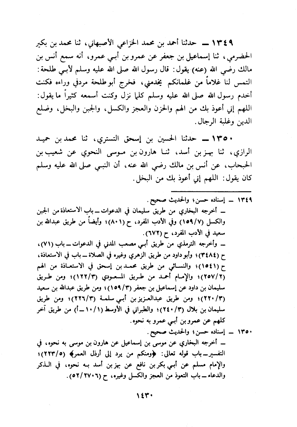 1350- حَدَّثَنَا الْحُسَيْنُ بْنُ إِسْحَاقَ التُّسْتَرِيُّ، حَدَّثَنَا مُحَمَّدُ بْنُ حُمَيْدٍ الرَّازِيُّ، حَدَّثَنَا بَهْزُ بْنُ أَسَدٍ، حَدَّثَنَا هَارُونُ بْنُ مُوسَى النَّحْوِيُّ، عَنْ شُعَيْبِ بْنِ الْحَبْحَابِ، عَنْ أَنَسِ بْنِ مَالِكٍ، رَضِيَ اللَّهُ عَنْهُ, أَنَّ النَّبِيَّ صَلى الله عَلَيه وَسَلم كَانَ يَقُولُ: اللَّهُمَّ إِنِّي أَعُوذُ بِكَ مِنَ الْبُخْلِ.