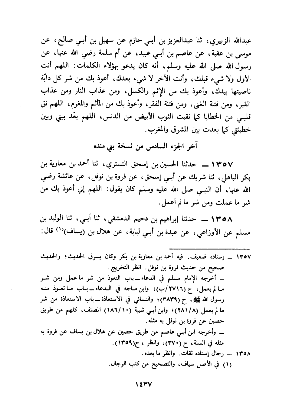 1357- حَدَّثَنَا الْحُسَيْنُ بْنُ إِسْحَاقَ التُّسْتَرِيُّ، حَدَّثَنَا أَحْمَدُ بْنُ مُعَاوِيَةَ بْنِ بَكْرٍ الْبَاهِلِيُّ، حَدَّثَنَا شَرِيكٌ، عَنْ أَبِي إِسْحَاقَ، عَنْ فَرْوَةَ بْنِ نَوْفَلٍ، عَنْ عَائِشَةَ، رَضِيَ اللَّهُ عَنْهَا, أَنَّ النَّبِيَّ صَلى الله عَلَيه وَسَلم كَانَ يَقُولُ: اللَّهُمَّ إِنِّي أَعُوذُ بِكَ مِنْ شَرِّ مَا عَمِلْتُ، وَمِنْ شَرِّ مَا لَمْ أَعْمَلْ.