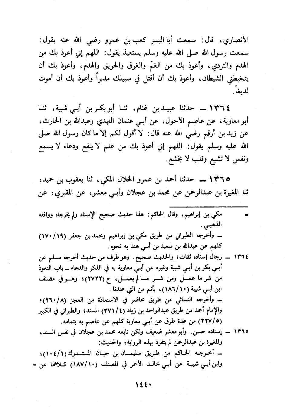 1364- حَدَّثَنَا عُبَيْدُ بْنُ غَنَّامٍ، حَدَّثَنَا أَبُو بَكْرِ بْنُ أَبِي شَيْبَةَ، حَدَّثَنَا أَبُو مُعَاوِيَةَ، عَنْ عَاصِمٍ الأَحْوَلِ، عَنْ أَبِي عُثْمَانَ النَّهْدِيِّ، وَعَبْدِ اللهِ بْنِ الْحَارِثِ، عَنْ زَيْدِ بْنِ أَرْقَمَ، رَضِيَ اللَّهُ عَنْهُ قَالَ: لاَ أَقُولُ لَكُمْ إِلاَّ مَا كَانَ رَسُولُ اللهِ صَلى الله عَلَيه وَسَلمِ يَقُولُ: اللَّهُمَّ إِنِّي أَعُوذُ بِكَ مِنْ عِلْمٍ لاَ يَنْفَعُ، وَدُعَاءٍ لاَ يُسْمَعُ، وَنَفْسٍ لاَ تَشْبَعُ، وَقَلْبٍ لاَ يَخْشَعُ.