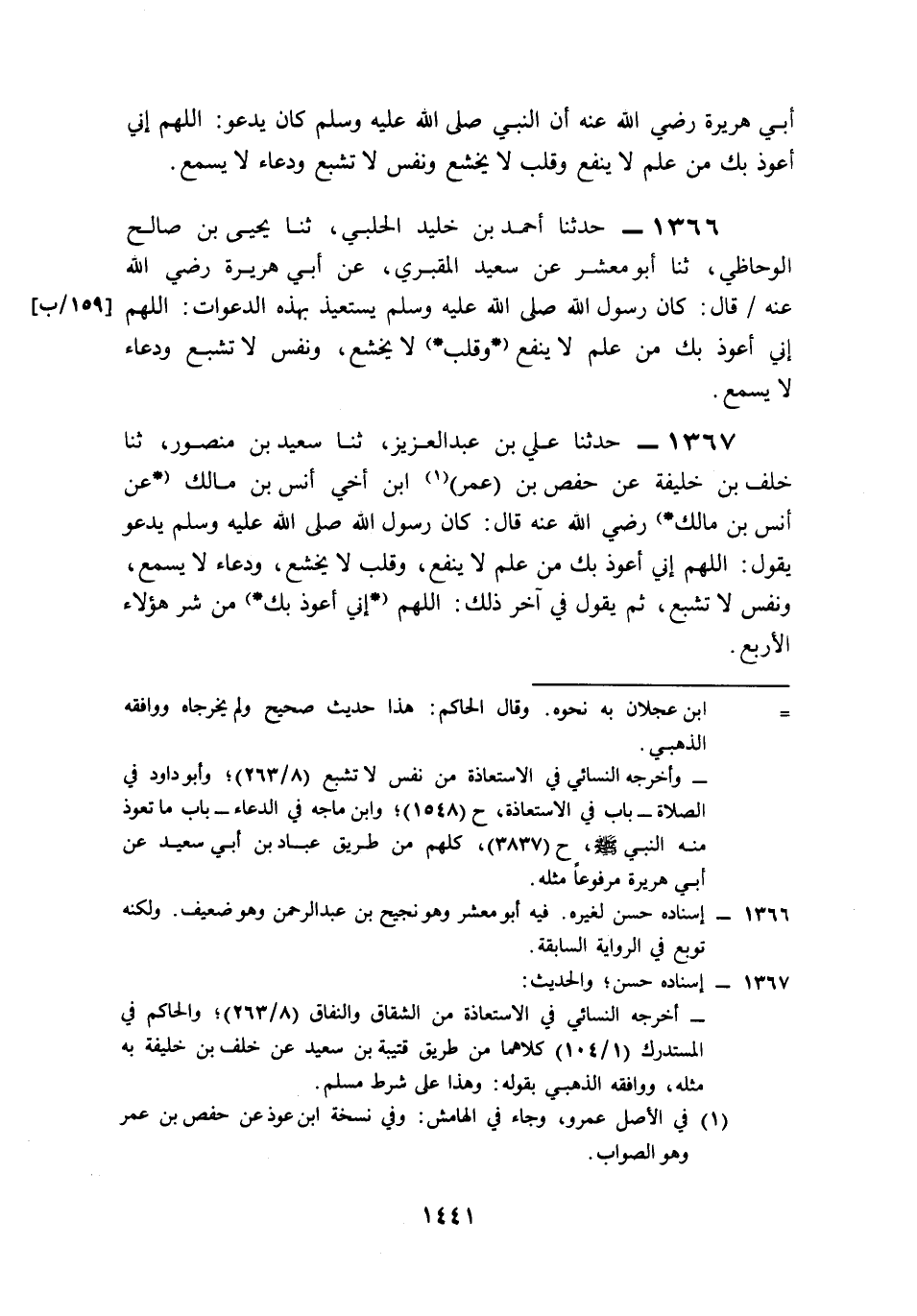 1366- حَدَّثَنَا أَحْمَدُ بْنُ خُلَيْدٍ الْحَلَبِيُّ، حَدَّثَنَا يَحْيَى بْنُ صَالِحٍ الْوحَاظِيُّ، حَدَّثَنَا أَبُو مَعْشَرٍ، عَنْ سَعِيدٍ الْمَقْبُرِيِّ، عَنْ أَبِي هُرَيْرَةَ، رَضِيَ اللَّهُ عَنْهُ قَالَ: كَانَ رَسُولُ اللهِ صَلى الله عَلَيه وَسَلم يَسْتَعِيذُ بِهَذِهِ الدَّعَوَاتِ: اللَّهُمَّ إِنِّي أَعُوذُ بِكَ مِنْ عِلْمٍ لاَ يَنْفَعُ، وَقَلْبٍ لاَ يَخْشَعُ، وَنَفْسٍ لاَ تَشْبَعُ، وَدُعَاءٍ لاَ يُسْمَعُ.