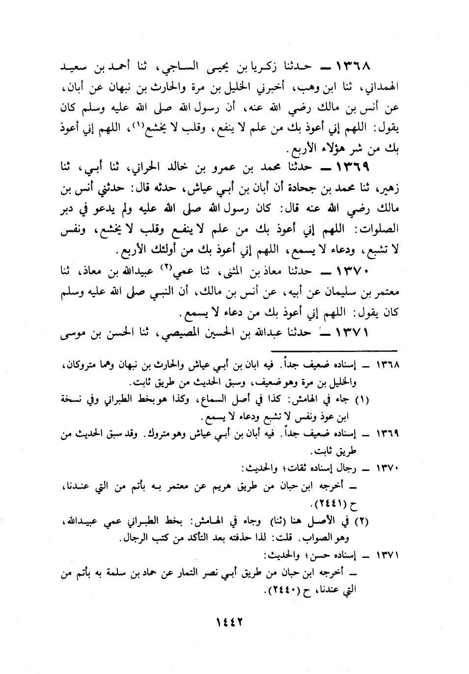 1371- حَدَّثَنَا عَبْدُ اللهِ بْنُ الْحُسَيْنِ الْمِصِّيصِيُّ، حَدَّثَنَا الْحَسَنُ بْنُ مُوسَى الأَشْيَبُ، حَدَّثَنَا حَمَّادُ بْنُ سَلَمَةَ، عَنْ قَتَادَةَ، عَنْ أَنَسٍ، رَضِيَ اللَّهُ عَنْهُ, أَنَّ النَّبِيَّ صَلى الله عَلَيه وَسَلم كَانَ يَقُولُ: اللَّهُمَّ إِنِّي أَعُوذُ بِكَ مِنْ دُعَاءٍ لاَ يُسْمَعُ.