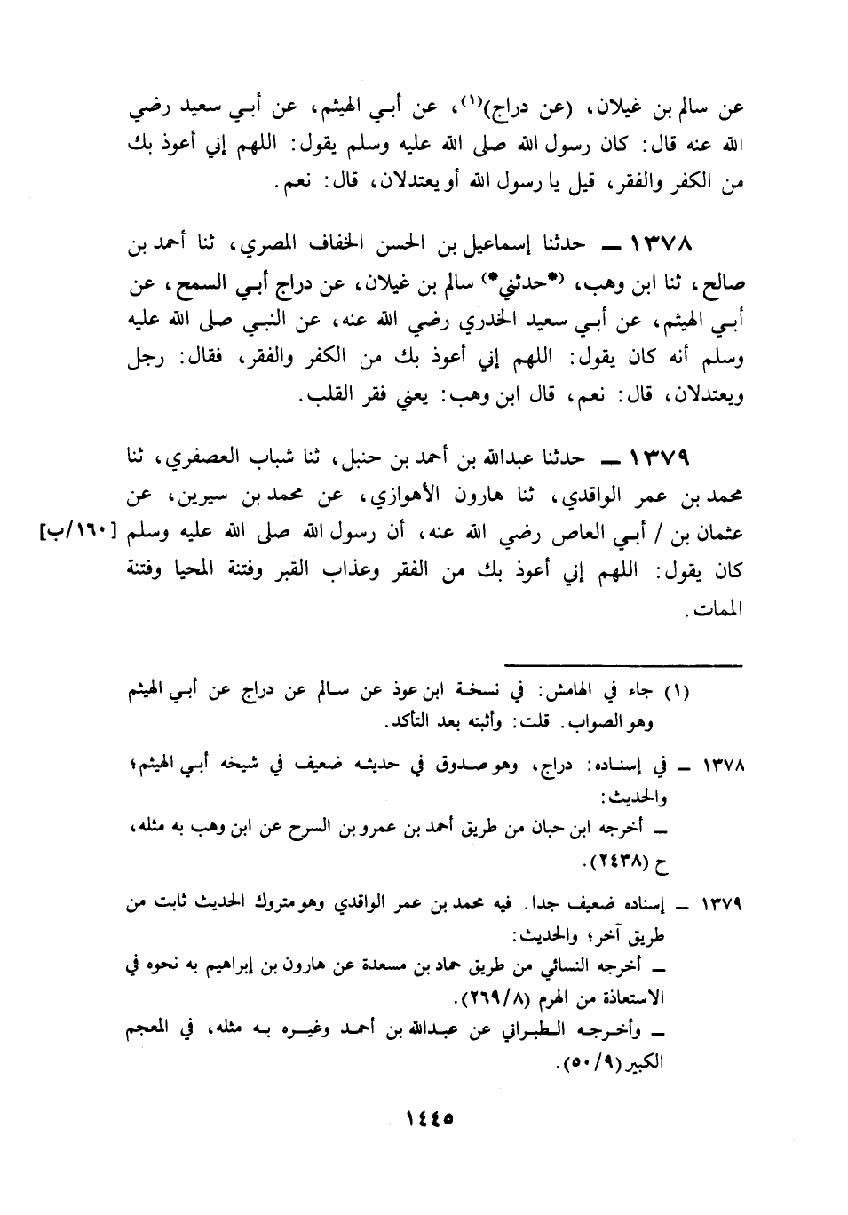 1379- حَدَّثَنَا عَبْدُ اللهِ بْنُ أَحْمَدَ بْنِ حَنْبَلٍ، حَدَّثَنَا شَبَابٌ الْعُصْفُرِيُّ، حَدَّثَنَا مُحَمَّدُ بْنُ عُمَرَ الْوَاقِدِيُّ، حَدَّثَنَا هَارُونُ الأَهْوَازِيُّ، عَنْ مُحَمَّدِ بْنِ سِيرِينَ، عَنْ عُثْمَانَ بْنِ أَبِي الْعَاصِ، رَضِيَ اللَّهُ عَنْهُ, أَنَّ رَسُولَ اللهِ صَلى الله عَلَيه وَسَلم كَانَ يَقُولُ: اللَّهُمَّ إِنِّي أَعُوذُ بِكَ مِنَ الْفَقْرِ وَعَذَابِ الْقَبْرِ، وَفِتْنَةِ الْمَحْيَا, وَفِتْنَةِ الْمَمَاتِ.