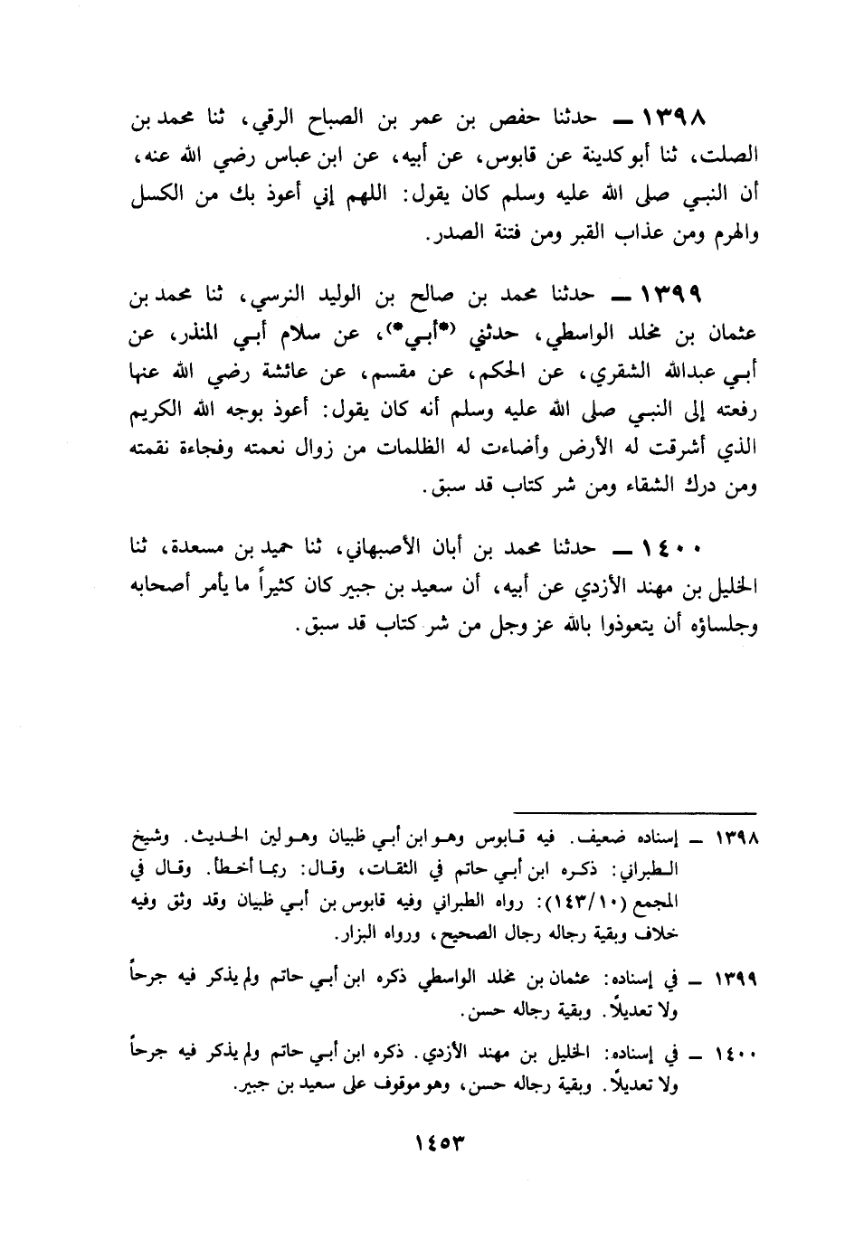 1400- حَدَّثَنَا مُحَمَّدُ بْنُ أَبَانَ الأَصْبَهَانِيُّ، حَدَّثَنَا حُمَيْدُ بْنُ مَسْعَدَةَ، حَدَّثَنَا الْخَلِيلُ بْنُ مُهَنَّدٍ الأَزْدِيُّ، عَنْ أَبِيهِ، أَنَّ سَعِيدَ بْنَ جُبَيْرٍ كَانَ كَثِيرًا مَا يَأْمُرُ أَصْحَابَهُ وَجُلَسَاءَهُ أَنْ يَتَعَوَّذُوا بِاللهِ عَزَّ وَجَلَّ مِنْ شَرِّ كِتَابٍ قَدْ سَبَقَ.