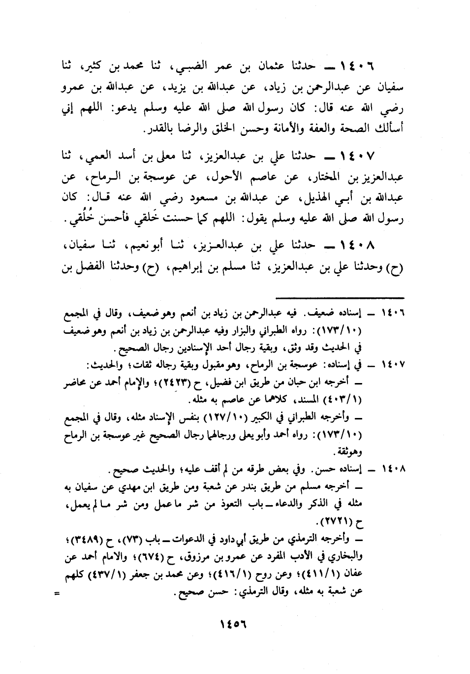 1406- حَدَّثَنَا عُثْمَانُ بْنُ عُمَرَ الضَّبِّيُّ، حَدَّثَنَا مُحَمَّدُ بْنُ كَثِيرٍ، حَدَّثَنَا سُفْيَانُ، عَنْ عَبْدِ الرَّحْمَنِ بْنِ زِيَادٍ، عَنْ عَبْدِ اللهِ بْنِ يَزِيدَ، عَنْ عَبْدِ اللهِ بْنِ عَمْرٍو، رَضِيَ اللَّهُ عَنْهُ قَالَ: كَانَ رَسُولُ اللهِ صَلى الله عَلَيه وَسَلم يَدْعُو: اللَّهُمَّ إِنِّي أَسْأَلُكَ الصِّحَّةَ وَالْعِفَّةَ، وَالأَمَانَةَ, وَحُسْنَ الْخُلُقِ، وَالرِّضَا بِالْقَدَرِ.