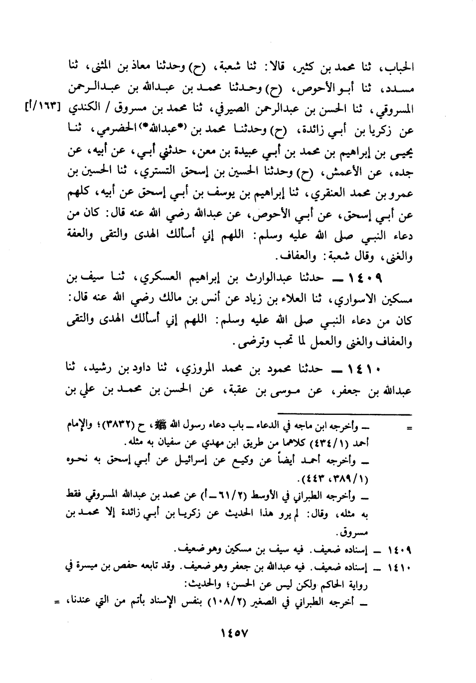 1409- حَدَّثَنَا عَبْدُ الْوَارِثِ بْنُ إِبْرَاهِيمَ الْعَسْكَرِيُّ، حَدَّثَنَا سَيْفُ بْنُ مِسْكِينٍ الأُسْوَارِيُّ، حَدَّثَنَا الْعَلاَءُ بْنُ زِيَادٍ، عَنْ أَنَسِ بْنِ مَالِكٍ، رَضِيَ اللَّهُ عَنْهُ قَالَ: كَانَ مِنْ دُعَاءِ النَّبِيِّ صَلى الله عَلَيه وَسَلم: اللَّهُمَّ إِنِّي أَسْأَلُكَ الْهُدَى، وَالتُّقَى، وَالْعَفَافَ، وَالْغِنَى, وَالْعَمَلَ لِمَا تُحِبُّ وَتَرْضَى.