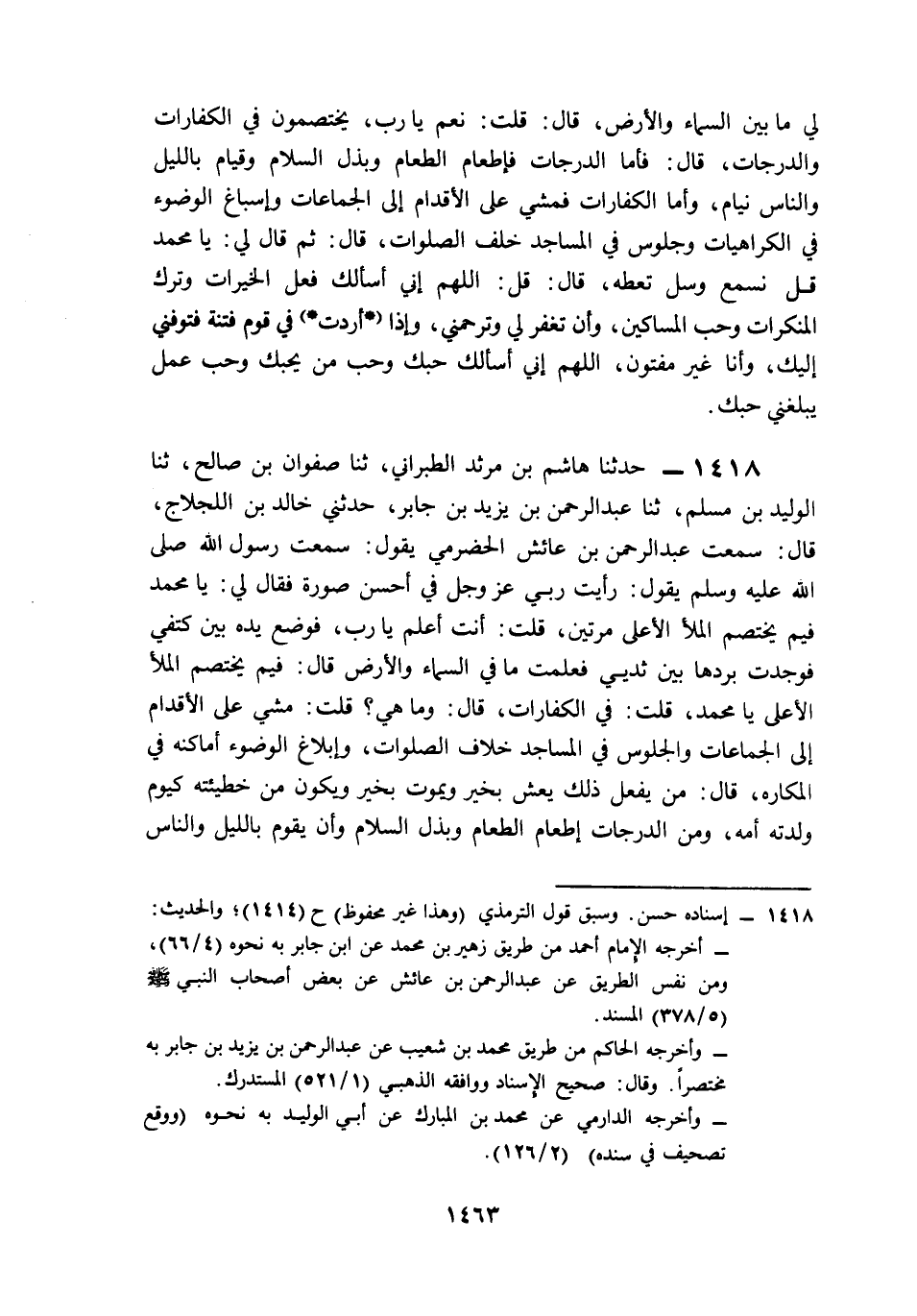 1418- حَدَّثَنَا هَاشِمُ بْنُ مَرْثَدٍ الطَّبَرَانِيُّ، حَدَّثَنَا صَفْوَانُ بْنُ صَالِحٍ، حَدَّثَنَا الْوَلِيدُ بْنُ مُسْلِمٍ، حَدَّثَنَا عَبْدُ الرَّحْمَنِ بْنُ يَزِيدَ بْنِ جَابِرٍ، حَدَّثَنِي خَالِدُ بْنُ اللَّجْلاَجِ، قَالَ: سَمِعْتُ عَبْدَ الرَّحْمِنْ بْنَ عَائِشٍ الْحَضْرَمِيَّ، يَقُولُ: سَمِعْتُ رَسُولَ اللهِ صَلى الله عَلَيه وَسَلم يَقُولُ: رَأَيْتُ رَبِّيَ عَزَّ وَجَلَّ فِي أَحْسَنِ صُورَةٍ فَقَالَ لِي: يَا مُحَمَّدُ, فِيمَ يَخْتَصِمُ الْمَلَأُ الأَعْلَى؟ مَرَّتَيْنِ، قُلْتُ: أَنْتَ أَعْلَمُ يَا رَبِّ، فَوَضَعَ يَدَهُ بَيْنَ كَتِفَيَّ, فَوَجَدْتُ بَرْدَهَا بَيْنَ ثَدْيَيَّ, فَعَلِمْتُ مَا فِي السَّمَاءِ وَالأَرْضِ، قَالَ: فِيمَ يَخْتَصِمُ الْمَلَأُ الأَعْلَى يَا مُحَمَّدُ؟ قُلْتُ: فِي الْكَفَّارَاتِ، قَالَ: وَمَا هِيَ؟