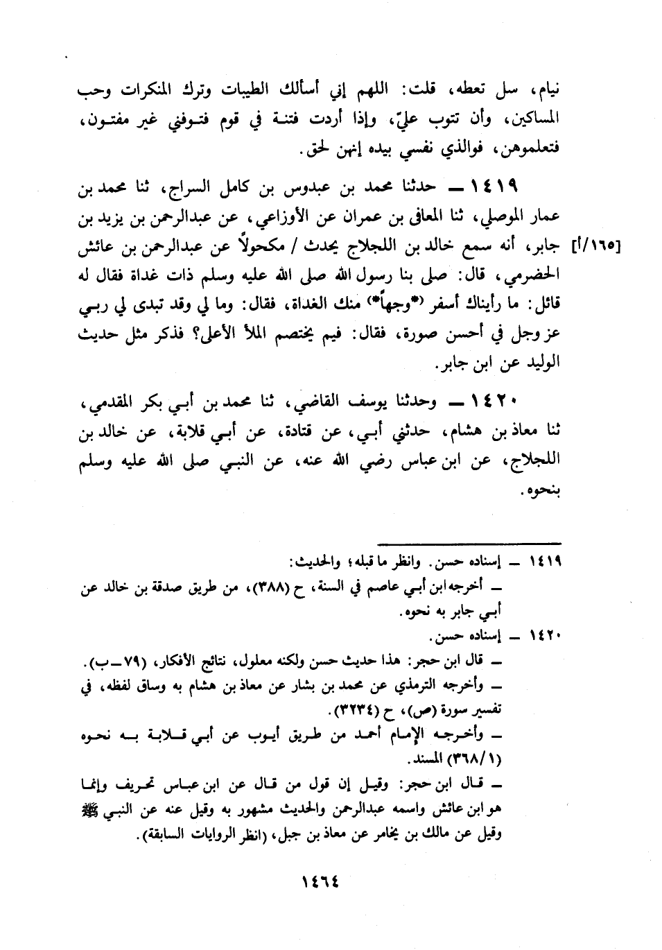 1419- حَدَّثَنَا مُحَمَّدُ بْنُ عَبْدوسِ بْنِ كَامِلٍ السَّرَّاجُ، حَدَّثَنَا مُحَمَّدُ بْنُ عَمَّارٍ الْمَوْصِلِيُّ، حَدَّثَنَا الْمُعَافَى بْنُ عِمْرَانَ، عَنِ الأَوْزَاعِيِّ، عَنْ عَبْدِ الرَّحْمَنِ بْنِ يَزِيدَ بْنِ جَابِرٍ، أَنَّهُ سَمِعَ خَالِدَ بْنَ اللَّجْلاَجِ يُحَدِّثُ مَكْحُولاً عَنْ عَبْدِ الرَّحْمَنِ بْنِ عَائِشٍ الْحَضْرَمِيِّ، قَالَ: صَلَّى بِنَا رَسُولُ اللهِ صَلى الله عَلَيه وَسَلم ذَاتَ غَدَاةٍ, فَقَالَ لَهُ قَائِلٌ: مَا رَأَيْنَاكَ أَسْفَرَ وَجْهًا مِنْكَ الْغَدَاةَ، فَقَالَ: وَمَا لِي وَقَدْ تَبَدَّى لِي رَبِّي عَزَّ وَجَلَّ فِي أَحْسَنِ صُورَةٍ, فَقَالَ: فِيمَ يَخْتَصِمُ الْمَلَأُ الأَعْلَى؟ فَذَكَرَ مِثْلَ حَدِيثِ الْوَلِيدِ عَنِ ابْنِ جَابِرٍ.