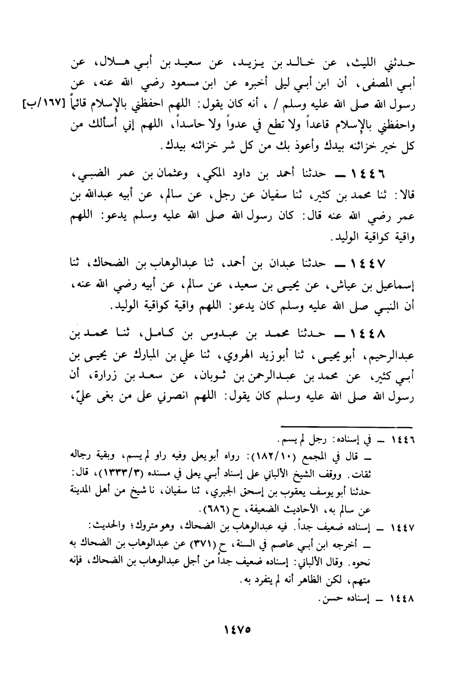 1446- حَدَّثَنَا أَحْمَدُ بْنُ دَاوُدَ الْمَكِّيُّ، وَعُثْمَانُ بْنُ عُمَرَ الضَّبِّيُّ، قَالاَ: حَدَّثَنَا مُحَمَّدُ بْنُ كَثِيرٍ، حَدَّثَنَا سُفْيَانُ، عَنْ رَجُلٍ، عَنْ سَالِمٍ، عَنْ أَبِيهِ عَبْدِ اللهِ بْنِ عُمَرَ، رَضِيَ اللَّهُ عَنْهُ قَالَ: كَانَ رَسُولُ اللهِ صَلى الله عَلَيه وَسَلم يَدْعُو: اللَّهُمَّ وَاقِيَةً كَوَاقِيَةِ الْوَلِيدِ.