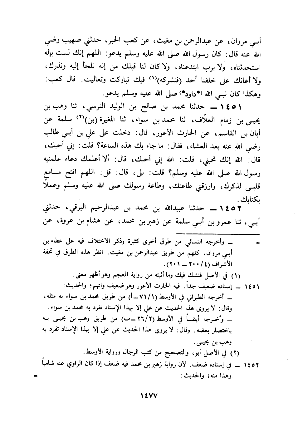 1451- حَدَّثَنَا مُحَمَّدُ بْنُ صَالِحِ بْنِ الْوَلِيدِ النَّرْسِيُّ، حَدَّثَنَا وَهْبُ بْنُ يَحْيَى بْنِ زِمَامٍ الْعَلاَّفُ، حَدَّثَنَا مُحَمَّدُ بْنُ سَوَاءٍ، حَدَّثَنَا الْمُغِيرَةُ بْنُ سَلَمَةَ، عَنْ أَبَانَ بْنِ الْقَاسِمِ، عَنِ الْحَارِثِ الأَعْوَرِ، قَالَ: دَخَلْتُ عَلَى عَلِيِّ بْنِ أَبِي طَالِبٍ رَضِيَ اللَّهُ عَنْهُ بَعْدَ الْعِشَاءِ فَقَالَ: مَا جَاءَ بِكَ هَذِهِ السَّاعَةَ؟ قُلْتُ: إِنِّي أُحِبُّكَ، قَالَ: اللهِ إِنَّكَ تُحِبُّنِي؟ قُلْتُ: اللهِ إِنِّي أُحِبُّكَ، قَالَ: أَلاَ أُعَلِّمُكَ دُعَاءً عَلَّمَنِيهِ رَسُولُ اللهِ صَلى الله عَلَيه وَسَلم؟ قُلْتُ: بَلَى، قَالَ: قُلِ: اللَّهُمَّ افْتَحْ مَسَامِعَ قَلْبِي لِذِكْرِكَ، وَارْزُقْنِي طَاعَتَكَ، وَطَاعَةَ رَسُولِكَ صَلى الله عَلَيه وَسَلم، وَعَمَلاً بِكِتَابِكَ.