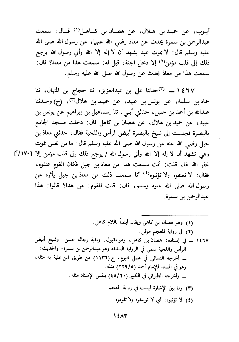 1467- حَدَّثَنَا عَلِيُّ بْنُ عَبْدِ الْعَزِيزِ، حَدَّثَنَا حَجَّاجُ بْنُ الْمِنْهَالِ، حَدَّثَنَا حَمَّادُ بْنُ سَلَمَةَ، عَنْ يُونُسَ بْنِ عُبَيْدٍ، عَنْ حُمَيْدِ بْنِ هِلاَلٍ (ح) وَحَدَّثَنَا عَبْدُ اللهِ بْنُ أَحْمَدَ بْنِ حَنْبَلٍ، حَدَّثَنِي أَبِي، حَدَّثَنَا إِسْمَاعِيلُ بْنُ إِبْرَاهِيمَ، عَنْ يُونُسَ بْنِ عُبَيْدٍ، عَنْ حُمَيْدِ بْنِ هِلاَلٍ، عَنْ هِصَّانَ بْنِ كَاهِلٍ، قَالَ: دَخَلْتُ مَسْجِدَ الْجَامِعِ بِالْبَصْرَةِ, فَجَلَسْتُ إِلَى شَيْخٍ بِالْبَصْرَةِ أَبْيَضَ الرَّأْسِ وَاللِّحْيَةِ, فَقَالَ: حَدَّثَنِي مُعَاذُ بْنُ جَبَلٍ رَضِيَ اللَّهُ عَنْهُ, عَنْ رَسُولِ اللهِ صَلى الله عَلَيه وَسَلم قَالَ: مَا مِنْ نَفْسٍ تَمُوتُ وَهِيَ تَشَهَّدُ أَنْ لاَ إِلَهَ إِلاَّ اللَّهُ, وَأَنِّي رَسُولُ اللهِ, يَرْجِعُ ذَلِكَ إِلَى قَلْبٍ مُؤْمِنٍ, إِلاَّ غَفَرَ اللَّهُ لَهَا, قُلْتُ: أَنْتَ سَمِعْتَ هَذَا مِنْ مُعَاذِ بْنِ جَبَلِ؟ فَكَأنَّ الْقَوْمَ عَنَّفُوهُ، فَقَالَ: لاَ تُعَنِّفُوهُ وَلاَ تُؤَنِّبُوهُ, أَنَا سَمِعْتُ ذَلِكَ مِنْ مُعَاذِ بْنِ جَبَلٍ, يَأْثُرُهُ عَنْ رَسُولِ اللهِ صَلى الله عَلَيه وَسَلم قَالَ: قُلْتُ لِلْقَوْمِ: مَنْ هَذَا؟ قَالُوا: هَذَا عَبْدُ الرَّحْمِنِ بْنُ سَمُرَةَ.