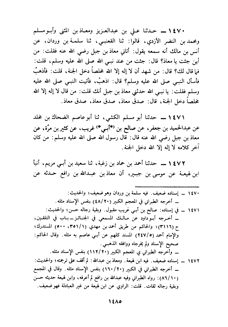 1471- حَدَّثَنَا أَبُو مُسْلِمٍ الْكَشِّيُّ، حَدَّثَنَا أَبُو عَاصِمٍ الضَّحَّاكُ بْنُ مَخْلَدٍ، عَنْ عَبْدِ الْحَمِيدِ بْنِ جَعْفَرٍ، عَنْ صَالِحِ بْنِ أَبِي عَرِيبٍ (1)، عَنْ كَثِيرِ بْنِ مُرَّةَ، عَنْ مُعَاذِ بْنِ جَبَلٍ، رَضِيَ اللَّهُ عَنْهُ قَالَ: قَالَ رَسُولُ اللهِ صَلى الله عَلَيه وَسَلم: مَنْ كَانَ آخِرُ كَلاَمِهِ لاَ إِلَهَ إِلاَّ اللَّهُ دَخَلَ الْجَنَّةَ.