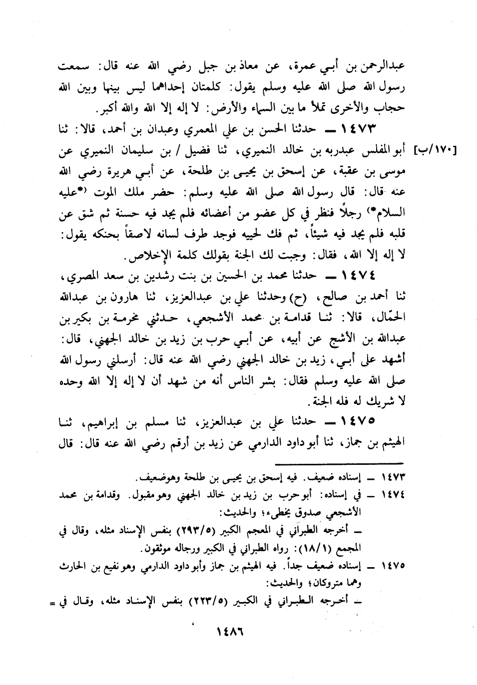 1473- حَدَّثَنَا الْحَسَنُ بْنُ عَلِيٍّ الْمَعْمَرِيُّ، وَعَبْدَانُ بْنُ أَحْمَدَ، قَالاَ: حَدَّثَنَا أَبُو الْمُغَلِّسِ (1) عَبْدُ رَبِّهِ بْنُ خَالِدٍ النُّمَيْرِيُّ، حَدَّثَنَا فُضَيْلُ بْنُ سُلَيْمَانَ النُّمَيْرِيُّ، عَنْ مُوسَى بْنِ عُقْبَةَ، عَنْ إِسْحَاقَ بْنِ يَحْيَى بْنِ طَلْحَةَ، عَنْ أَبِي هُرَيْرَةَ، رَضِيَ اللَّهُ عَنْهُ قَالَ: قَالَ رَسُولُ اللهِ صَلى الله عَلَيه وَسَلم: حَضَرَ مَلَكُ الْمَوْتِ عَلَيْهِ السَّلاَمُ رَجُلاً, فَنَظَرَ فِي كُلِّ عُضْو مِنْ أَعْضَائِهِ, فَلَمْ يَجِدْ فِيهِ حَسَنَةً، ثُمَّ شَقَّ عَنْ قَلْبِهِ, فَلَمْ يَجِدْ فِيهِ شَيْئًا، ثُمَّ فَكَّ لِحْيَيْهِ, فَوَجَدَ طَرْفَ لِسَانِهِ لاَصِقًا بِحَنَكِهِ يَقُولُ: لاَ إِلَهَ إِلاَّ اللَّهُ، فَقَالَ: وَجَبَتْ لَكَ الْجَنَّةُ, بِقَوْلِكَ كَلِمَةَ الإِخْلاَصِ.