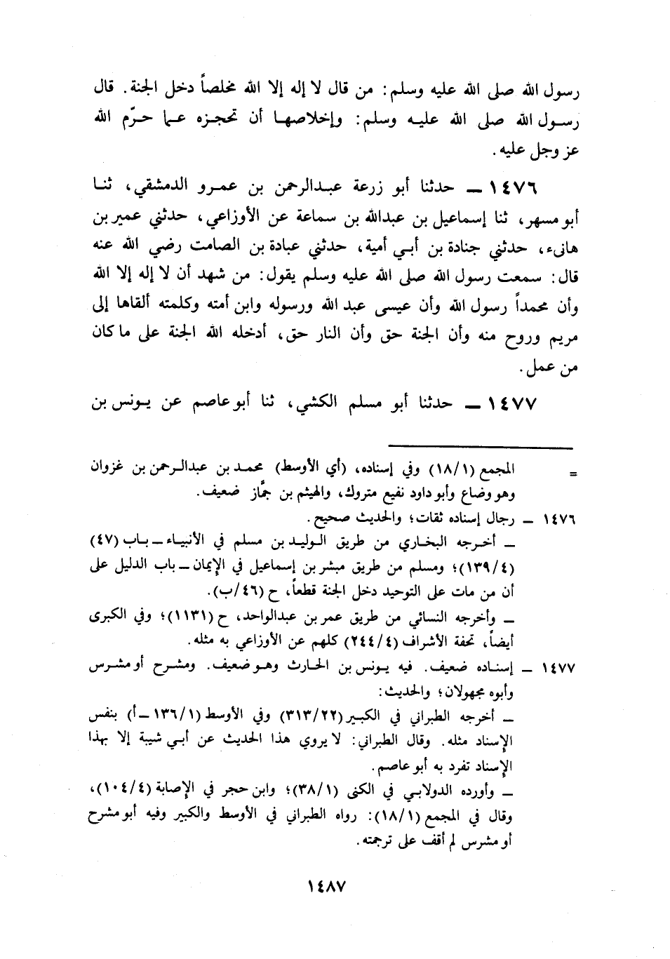 1476- حَدَّثَنَا أَبُو زُرْعَةَ عَبْدُ الرَّحْمِنِ بْنُ عَمْرٍو الدِّمَشْقِيُّ، حَدَّثَنَا أَبُو مُسْهِرٍ، حَدَّثَنَا إِسْمَاعِيلُ بْنُ عَبْدِ اللهِ بْنِ سَمَاعَةَ، عَنِ الأَوْزَاعِيِّ، حَدَّثَنِي عُمَيْرُ بْنُ هَانِئٍ، حَدَّثَنِي جُنَادَةُ بْنُ أَبِي أُمَيَّةَ، حَدَّثَنِي عُبَادَةُ بْنُ الصَّامِتِ، رَضِيَ اللَّهُ عَنْهُ قَالَ: سَمِعْتُ رَسُولَ اللهِ صَلى الله عَلَيه وَسَلم يَقُولُ: مَنْ شَهِدَ أَنْ لاَ إِلَهَ إِلاَّ اللَّهُ، وَأَنَّ مُحَمَّدًا رَسُولُ اللهِ، وَأَنَّ عِيسَى عَبْدُ اللهِ وَرَسُولُهُ, وَابْنُ أَمَتِهِ وَكَلِمَتُهُ, أَلْقَاهَا إِلَى مَرْيَمَ وَرُوحٌ مِنْهُ، وَأَنَّ الْجَنَّةَ حَقٌّ، وَأَنَّ النَّارَ حَقٌّ, أَدْخَلَهُ اللَّهُ الْجَنَّةَ عَلَى مَا كَانَ مِنْ عَمَلٍ.