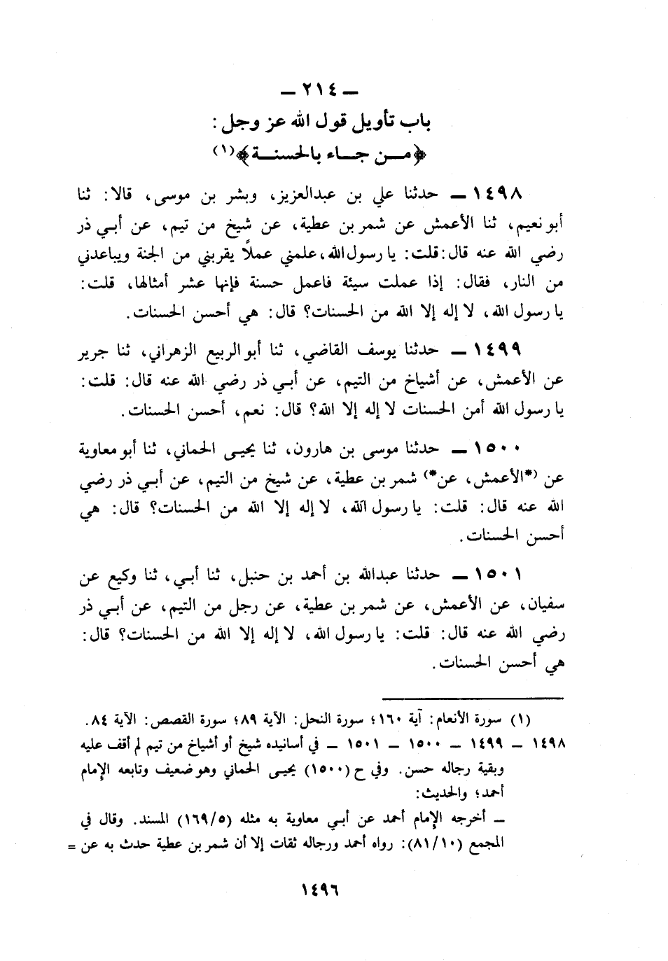 1500- حَدَّثَنَا مُوسَى بْنُ هَارُونَ، حَدَّثَنَا يَحْيَى الْحِمَّانِيُّ، حَدَّثَنَا أَبُو مُعَاوِيَةَ، عَنِ الأَعْمَشِ، عَنْ شِمْرِ بْنِ عَطِيَّةَ، عَنْ شَيْخٍ مِنَ التَّيْمِ, عَنْ أَبِي ذَرٍّ، رَضِيَ اللَّهُ عَنْهُ قَالَ: قُلْتُ: يَا رَسُولَ اللهِ, لاَ إِلَهَ إِلاَّ اللَّهُ مِنَ الْحَسَنَاتِ؟ قَالَ: هِيَ أَحْسَنُ الْحَسَنَاتِ.