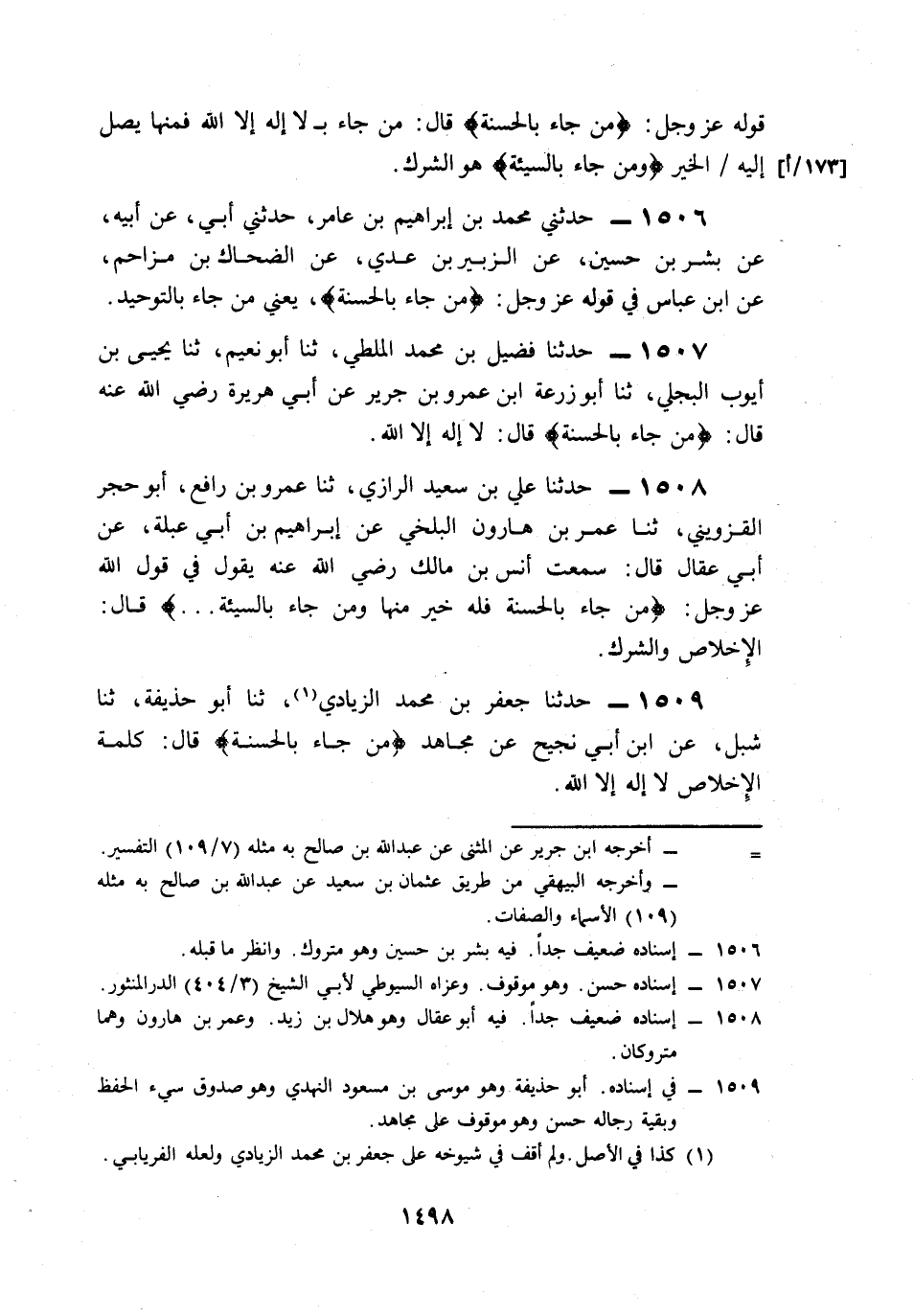 1506- حَدَّثَنِي مُحَمَّدُ بْنُ إِبْرَاهِيمَ بْنِ عَامِرٍ، حَدَّثَنِي أَبِي، عَنْ أَبِيهِ، عَنْ بِشْرِ بْنِ حُسَيْنٍ، عَنِ الزُّبَيْرِ بْنِ عَدِيٍّ، عَنِ الضَّحَّاكِ بْنِ مُزَاحِمٍ، عَنِ ابْنِ عَبَّاسٍ، فِي قَوْلِهِ عَزَّ وَجَلَّ: {مَنْ جَاءَ بِالْحَسَنَةِ} يَعْنِي مِنْ جَاءَ بِالتَّوْحِيدِ.