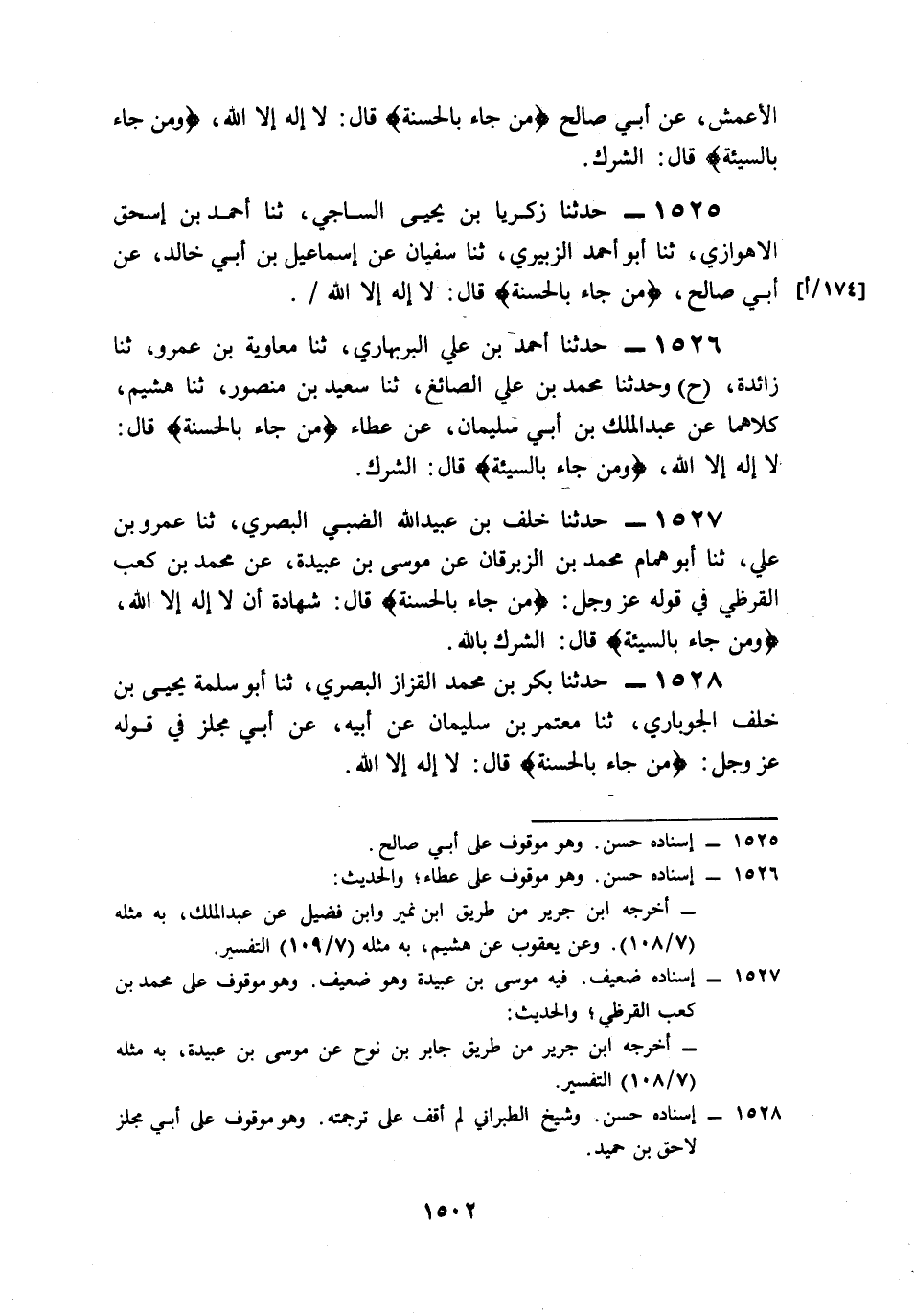 1525- حَدَّثَنَا زَكَرِيَّا بْنُ يَحْيَى السَّاجِيُّ، حَدَّثَنَا أَحْمَدُ بْنُ إِسْحَاقَ الأَهْوَازِيُّ، حَدَّثَنَا أَبُو أَحْمَدَ الزُّبَيْرِيُّ، حَدَّثَنَا سُفْيَانُ، عَنْ إِسْمَاعِيلَ بْنِ أَبِي خَالِدٍ، عَنْ أَبِي صَالِحٍ، {مَنْ جَاءَ بِالْحَسَنَةِ} قَالَ: لاَ إِلَهَ إِلاَّ اللَّهُ.