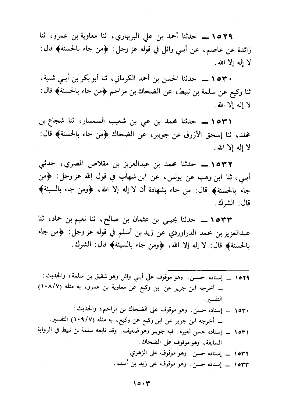 1533- حَدَّثَنَا يَحْيَى بْنُ عُثْمَانَ بْنِ صَالِحٍ، حَدَّثَنَا نُعَيْمُ بْنُ حَمَّادٍ، حَدَّثَنَا عَبْدُ الْعَزِيزِ بْنُ مُحَمَّدٍ الدَّرَاوَرْدِيُّ، عَنْ زَيْدِ بْنِ أَسْلَمَ، فِي قَوْلِهِ عَزَّ وَجَلَّ: {مَنْ جَاءَ بِالْحَسَنَةِ} قَالَ: لاَ إِلَهَ إِلاَّ اللَّهُ, {وَمَنْ جَاءَ بِالسَّيِّئَةِ} قَالَ: الشِّرْكُ.