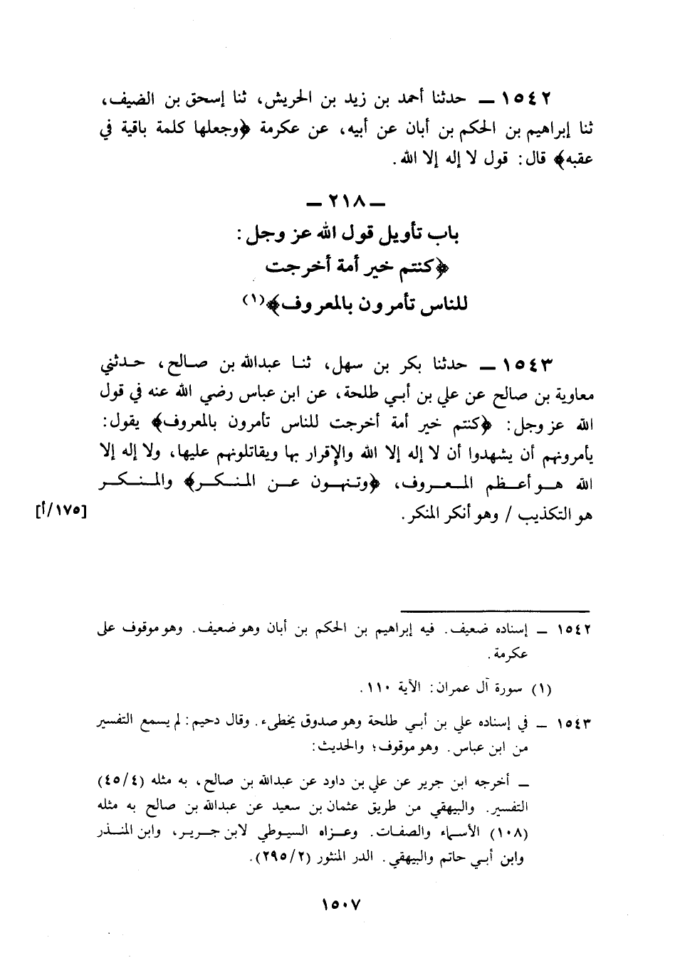 1543- حَدَّثَنَا بَكْرُ بْنُ سَهْلٍ، حَدَّثَنَا عَبْدُ اللهِ بْنُ صَالِحٍ، حَدَّثَنِي مُعَاوِيَةُ بْنُ صَالِحٍ، عَنْ عَلِيِّ بْنِ أَبِي طَلْحَةَ، عَنِ ابْنِ عَبَّاسٍ، رَضِيَ اللَّهُ عَنْهُ, فِي قَوْلِ اللهِ عَزَّ وَجَلَّ: {كُنْتُمْ خَيْرَ أُمَّةٍ أُخْرِجَتْ لِلنَّاسِ تَأْمُرُونَ بِالْمَعْرُوفِ} يَقُولُ: يَأْمُرُونَهُمْ أَنْ يَشْهَدُوا أَنْ لاَ إِلَهَ إِلاَّ اللَّهُ، وَالإِقْرَارِ بِهَا، وَيُقَاتِلُونَهُمْ عَلَيْهَا، وَلاَ إِلَهَ إِلاَّ اللَّهُ, هُوَ أَعْظَمُ الْمَعْرُوفِ {وَتَنْهَوْنَ عَنِ الْمُنْكَرِ} وَالْمُنْكَرُ هُوَ التَّكْذِيبُ, وَهُوَ أَنْكَرُ الْمُنْكَرِ.