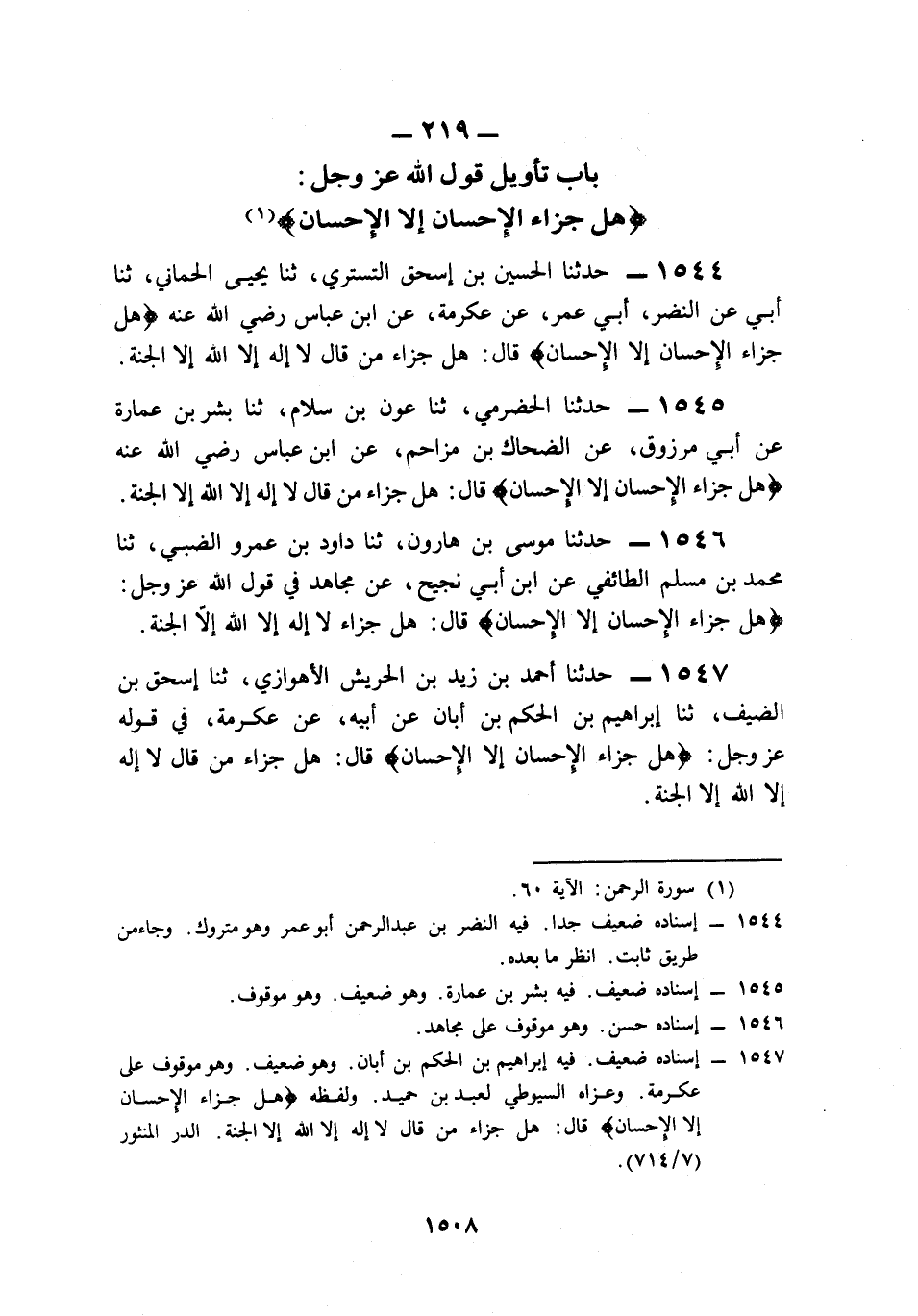 219- بَابُ تَأْوِيلِ قَوْلِ اللهِ عَزَّ وَجَلَّ: {هَلْ جَزَاءُ الإِحْسَانِ إِلاَّ الإِحْسَانُ}.