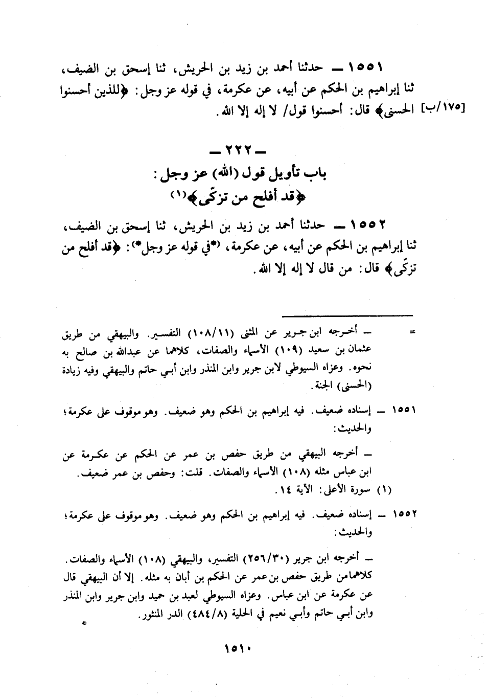 1552- حَدَّثَنَا أَحْمَدُ بْنُ زَيْدِ بْنِ الْحَرِيشِ، حَدَّثَنَا إِسْحَاقُ بْنُ الضَّيْفِ، حَدَّثَنَا إِبْرَاهِيمُ بْنُ الْحَكَمِ، عَنْ أَبِيهِ، عَنْ عِكْرِمَةَ، فِي قَوْلِهِ عَزَّ وَجَلَّ: {قَدْ أَفْلَحَ مَنْ تَزَكَّى} قَالَ: مَنْ قَالَ لاَ إِلَهَ إِلاَّ اللَّهُ.