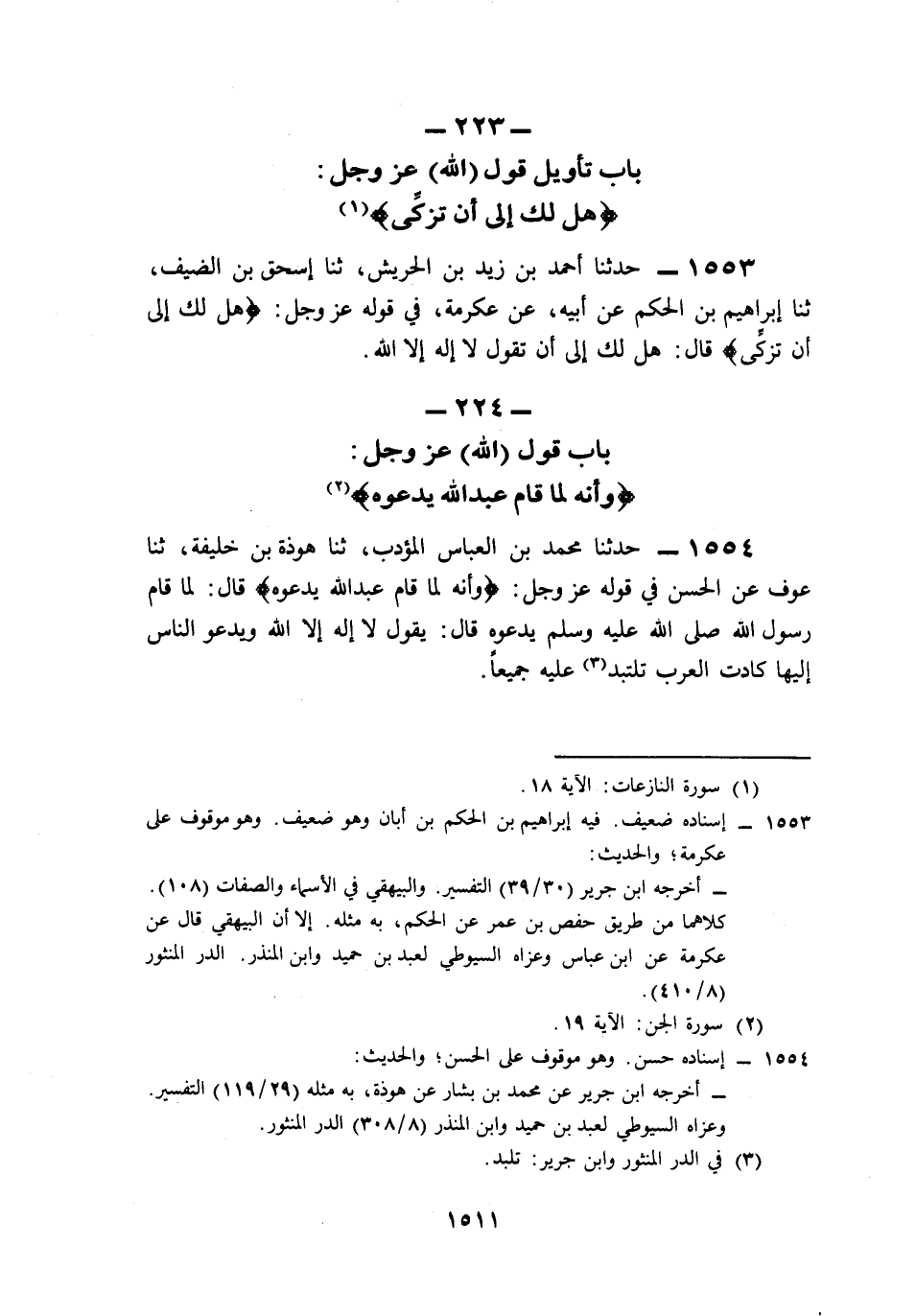 1553- حَدَّثَنَا أَحْمَدُ بْنُ زَيْدِ بْنِ الْحَرِيشِ، حَدَّثَنَا إِسْحَاقُ بْنُ الضَّيْفِ، حَدَّثَنَا إِبْرَاهِيمُ بْنُ الْحَكَمِ، عَنْ أَبِيهِ، عَنْ عِكْرِمَةَ، فِي قَوْلِهِ عَزَّ وَجَلَّ: {هَلْ لَكَ إِلَى أَنْ تَزَكَّى} قَالَ: هَلْ لَكَ إِلَى أَنْ تَقُولَ لاَ إِلَهَ إِلاَّ اللَّهُ.