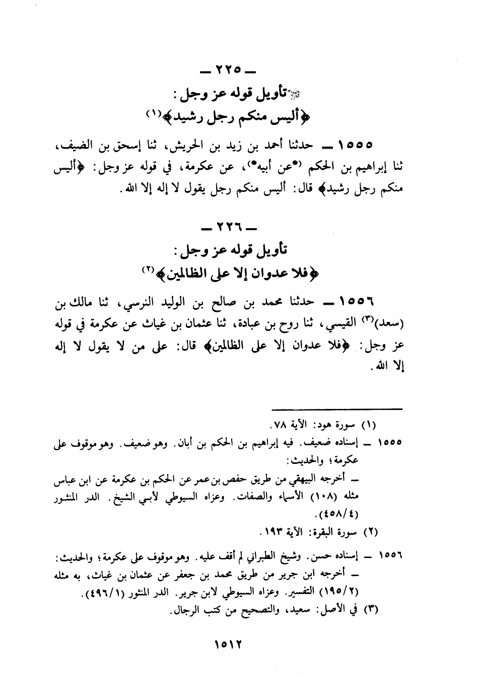 1555- حَدَّثَنَا أَحْمَدُ بْنُ زَيْدِ بْنِ الْحَرِيشِ، حَدَّثَنَا إِسْحَاقُ بْنُ الضَّيْفِ، حَدَّثَنَا إِبْرَاهِيمُ بْنُ الْحَكَمِ، عَنْ أَبِيهِ، عَنْ عِكْرِمَةَ، فِي قَوْلِهِ عَزَّ وَجَلَّ: {أَلَيْسَ مِنْكُمْ رَجُلٌ رَشِيدٌ} قَالَ: أَلَيْسَ مِنْكُمْ رَجُلٌ يَقُولُ: لاَ إِلَهَ إِلاَّ اللَّهُ.
